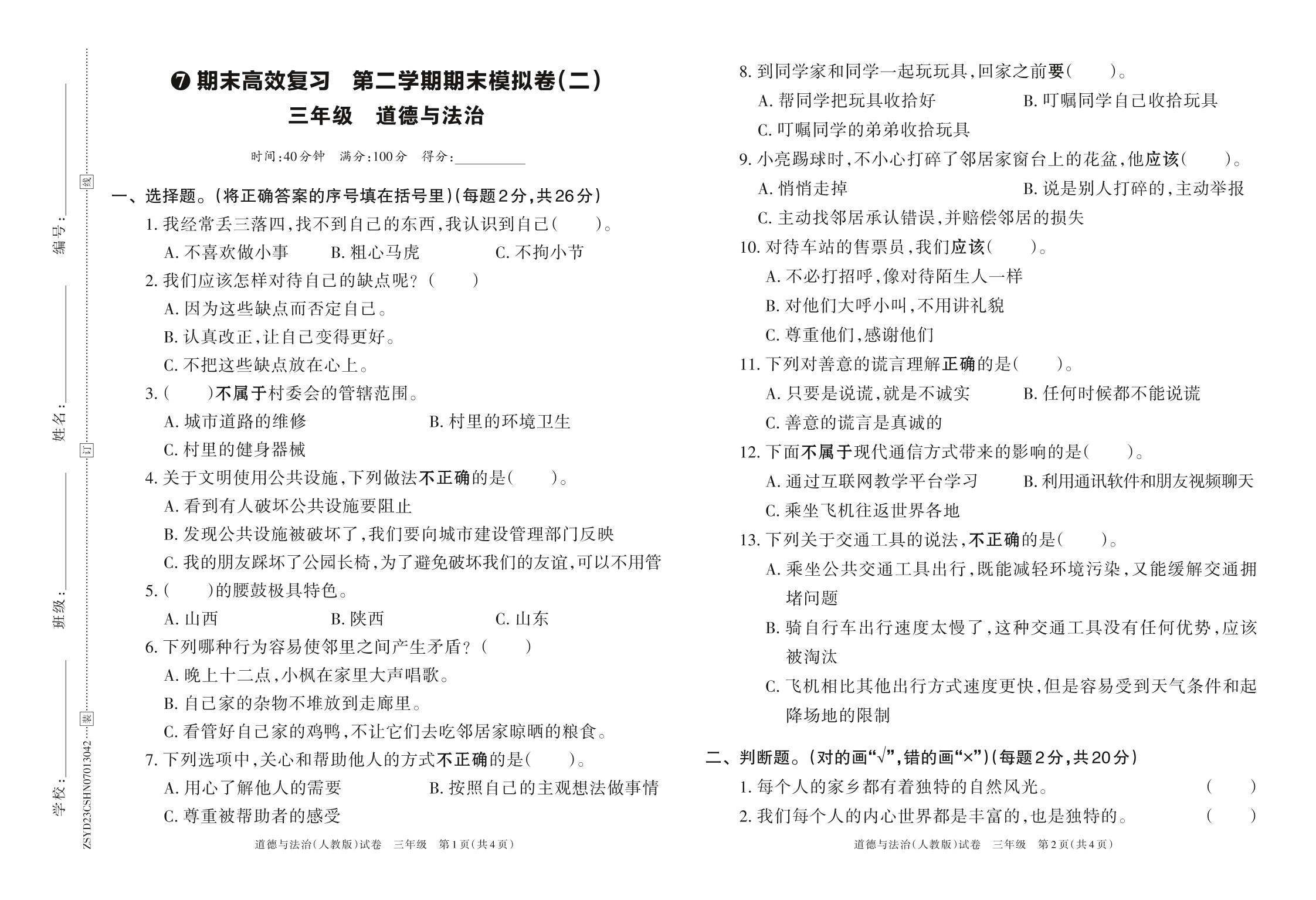 2023年春下册三年级道德与法治人教版 期末高效复习 第二学期期末模拟卷(二)