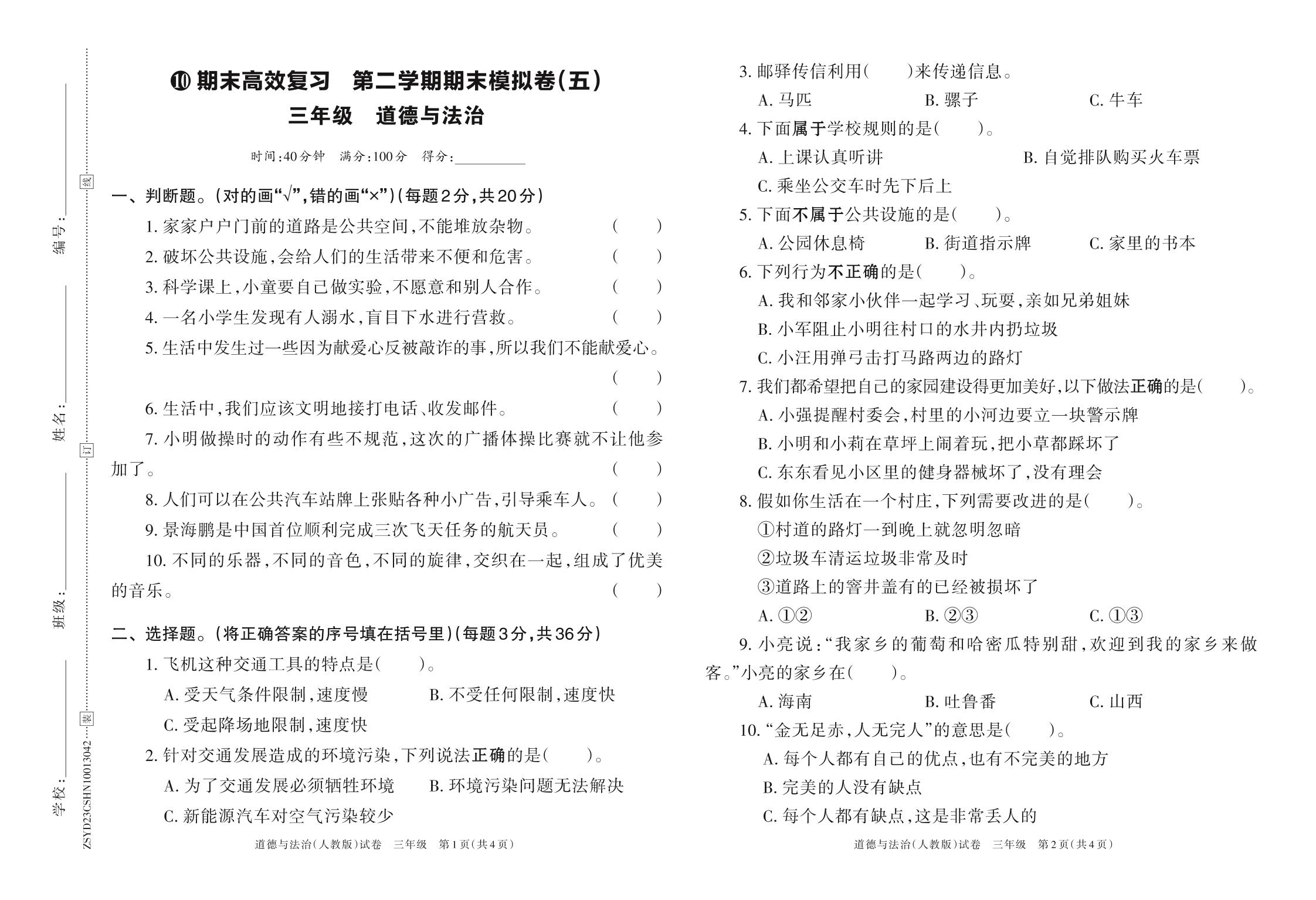 2023年春下册三年级道德与法治人教版 期末高效复习 第二学期期末模拟卷(五)