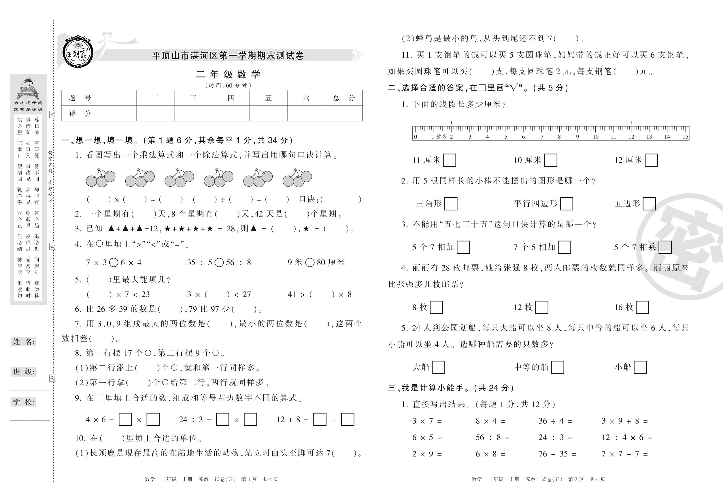 2016-2017学年第一学期平顶山市湛河区二年级数学试卷(苏教版)【5】
