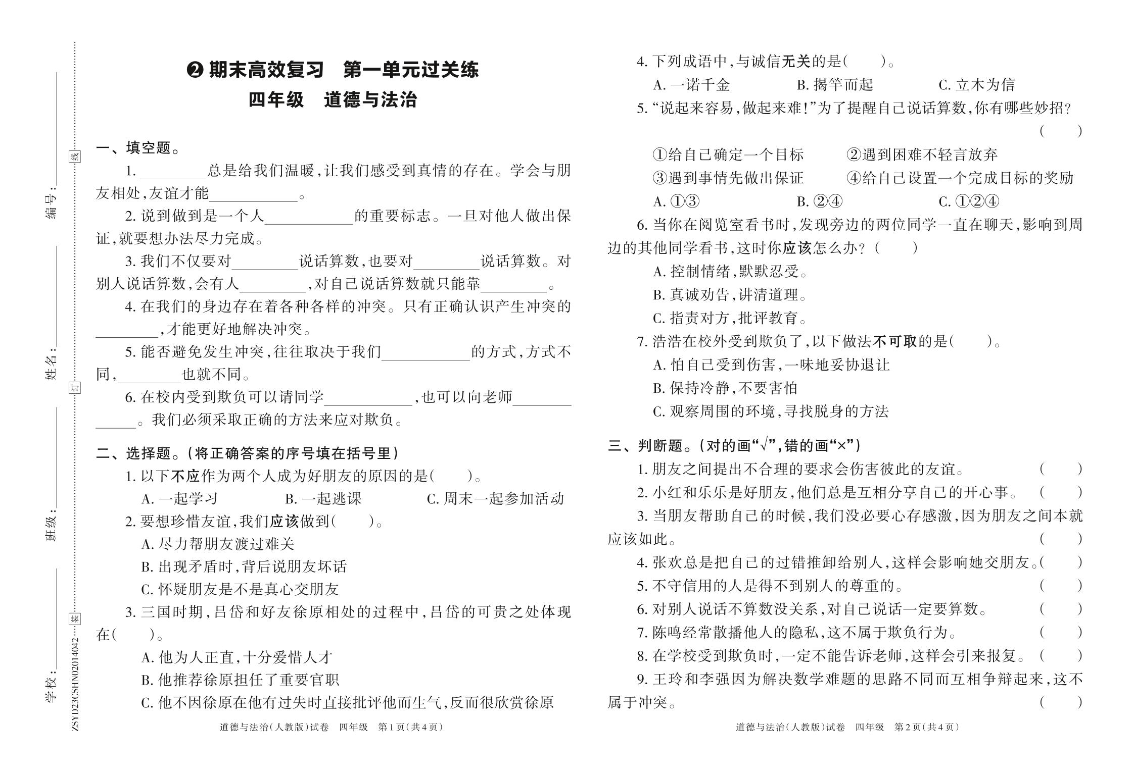 2023年春下册四年级道德与法治人教版 期末高效复习 第一单元过关练