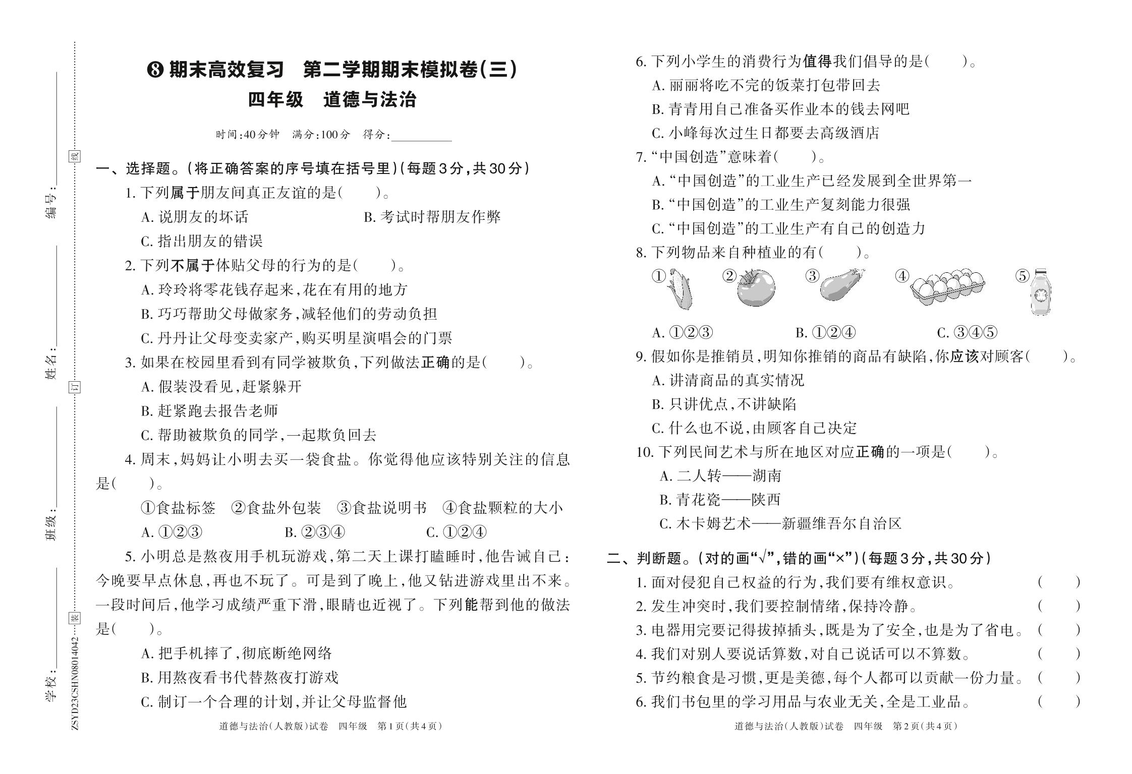2023年春下册四年级道德与法治人教版 期末高效复习 第二学期期末模拟卷(三)