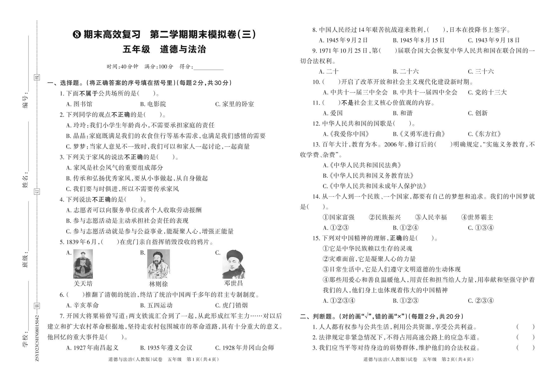 2023年春下册五年级道德与法治人教版 期末高效复习 第二学期期末模拟卷(三)