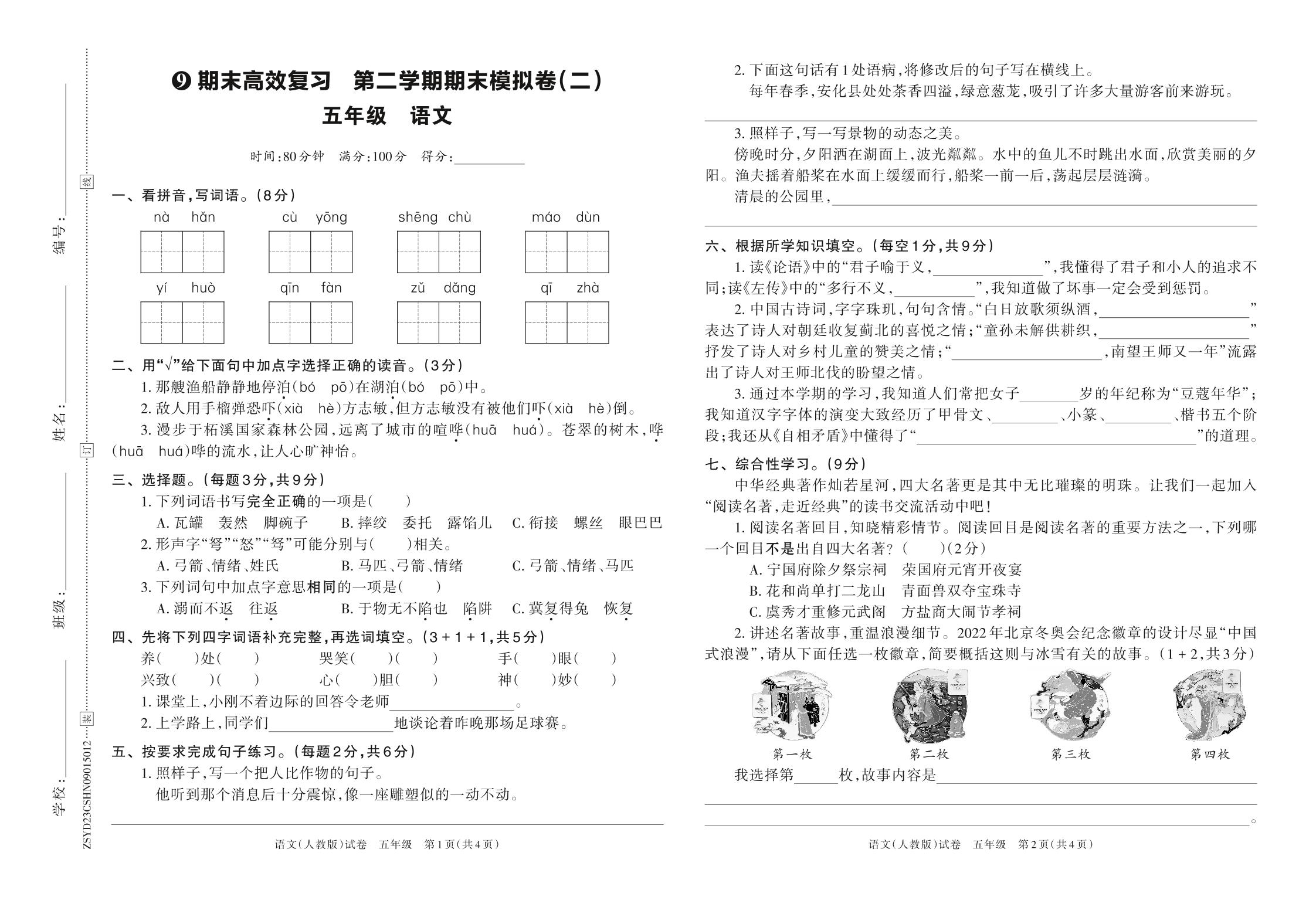 2023年春下册五年级语文人教版 期末高效复习 第二学期期末模拟卷(二)