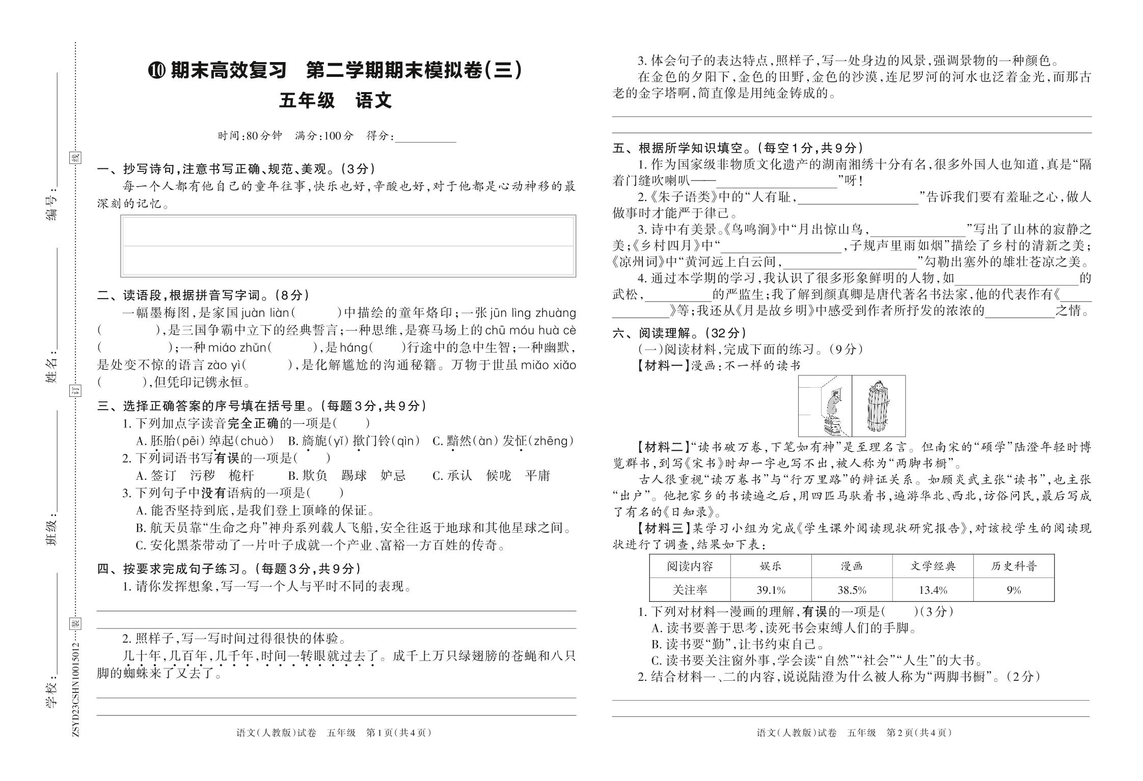 2023年春下册五年级语文人教版 期末高效复习 第二学期期末模拟卷(三)