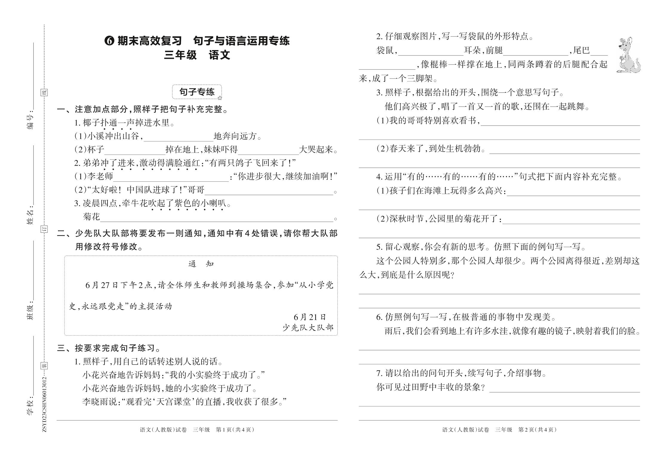 2023年春下册三年级语文人教版 期末高效复习 句子与语言运用专练