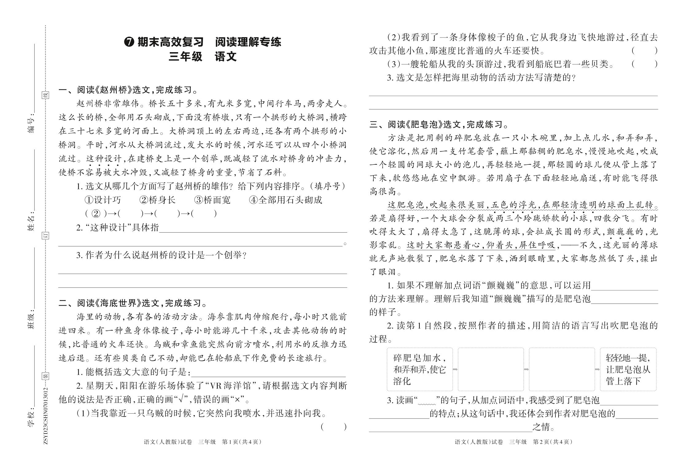 2023年春下册三年级语文人教版 期末高效复习 阅读理解专练