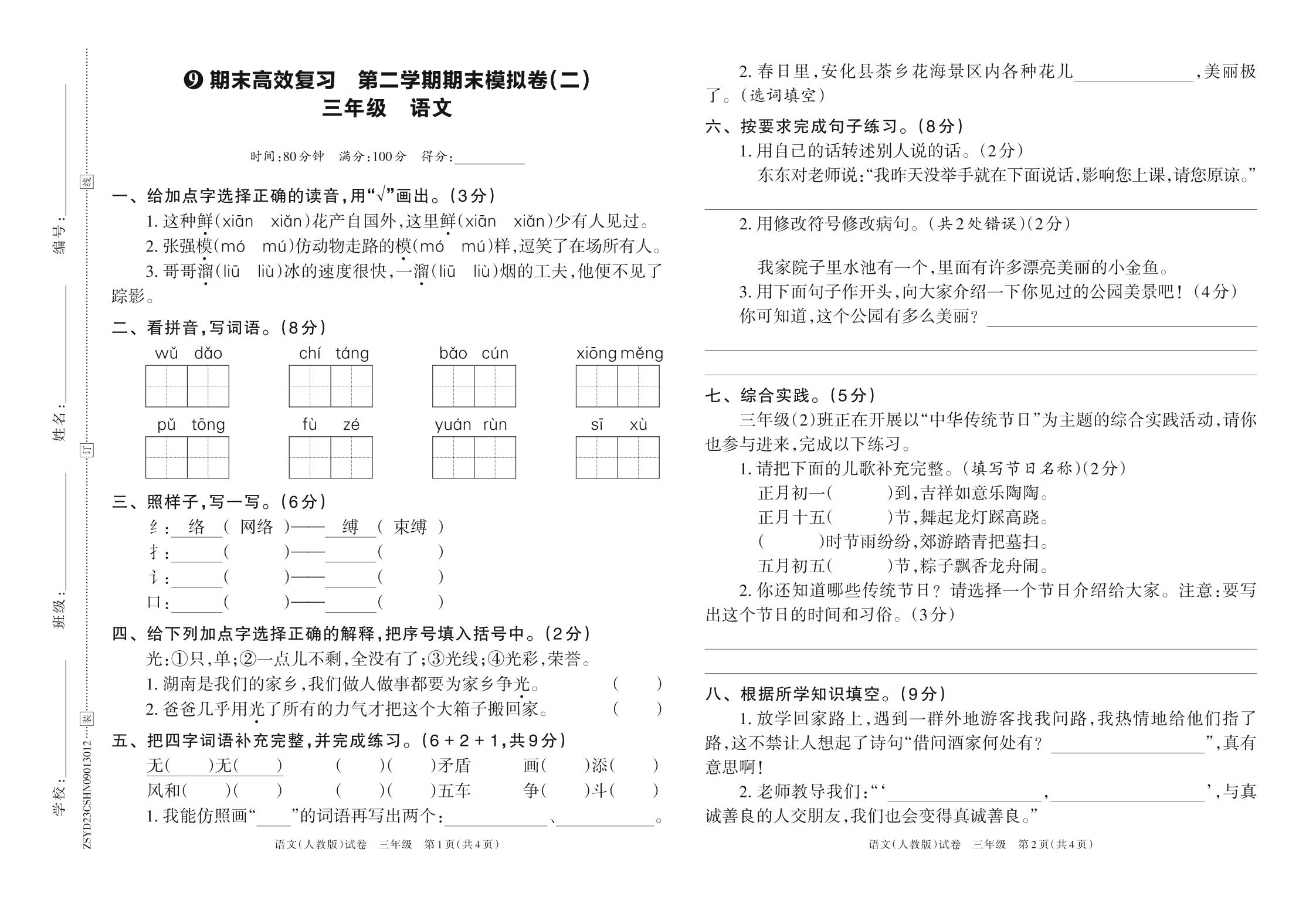 2023年春下册三年级语文人教版 期末高效复习 第二学期期末模拟卷(二)