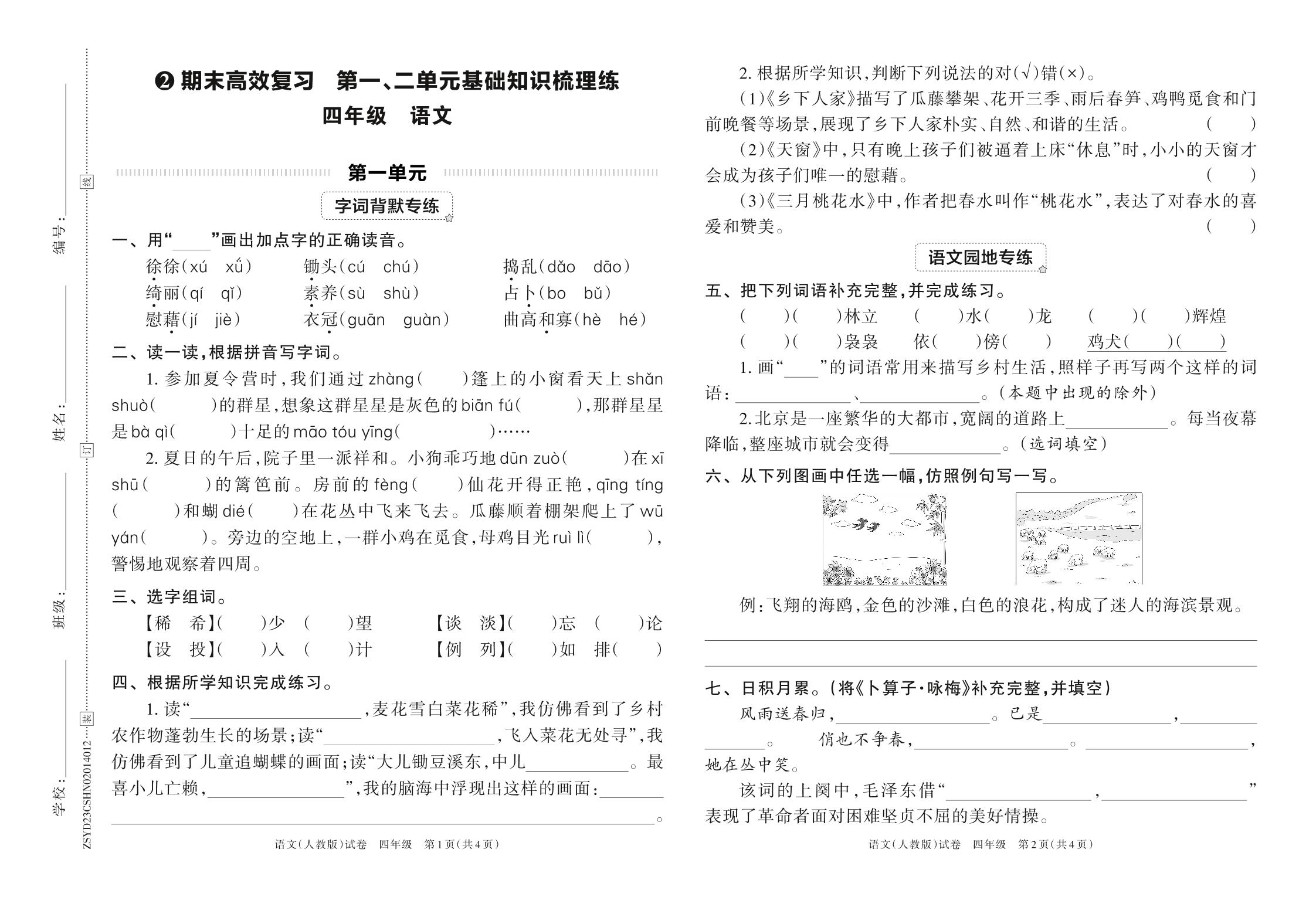 2023年春下册四年级语文人教版 期末高效复习 第一、二单元基础知识梳理练
