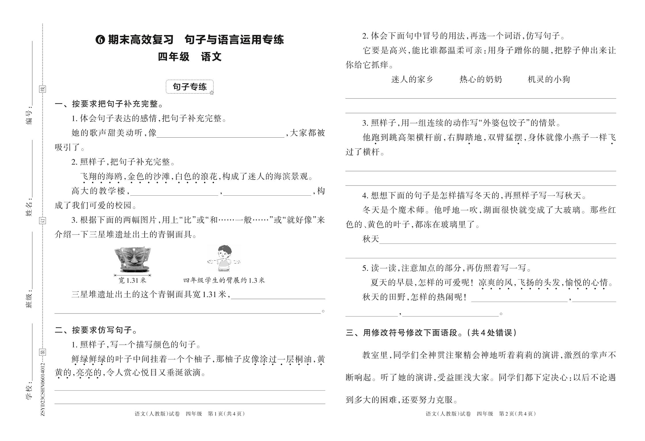 2023年春下册四年级语文人教版 期末高效复习 句子与语言运用专练