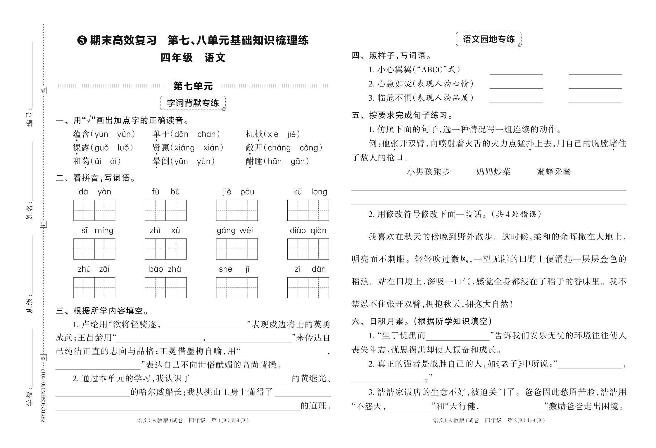 2023年春下册四年级语文人教版 期末高效复习 第七、八单元基础知识梳理练