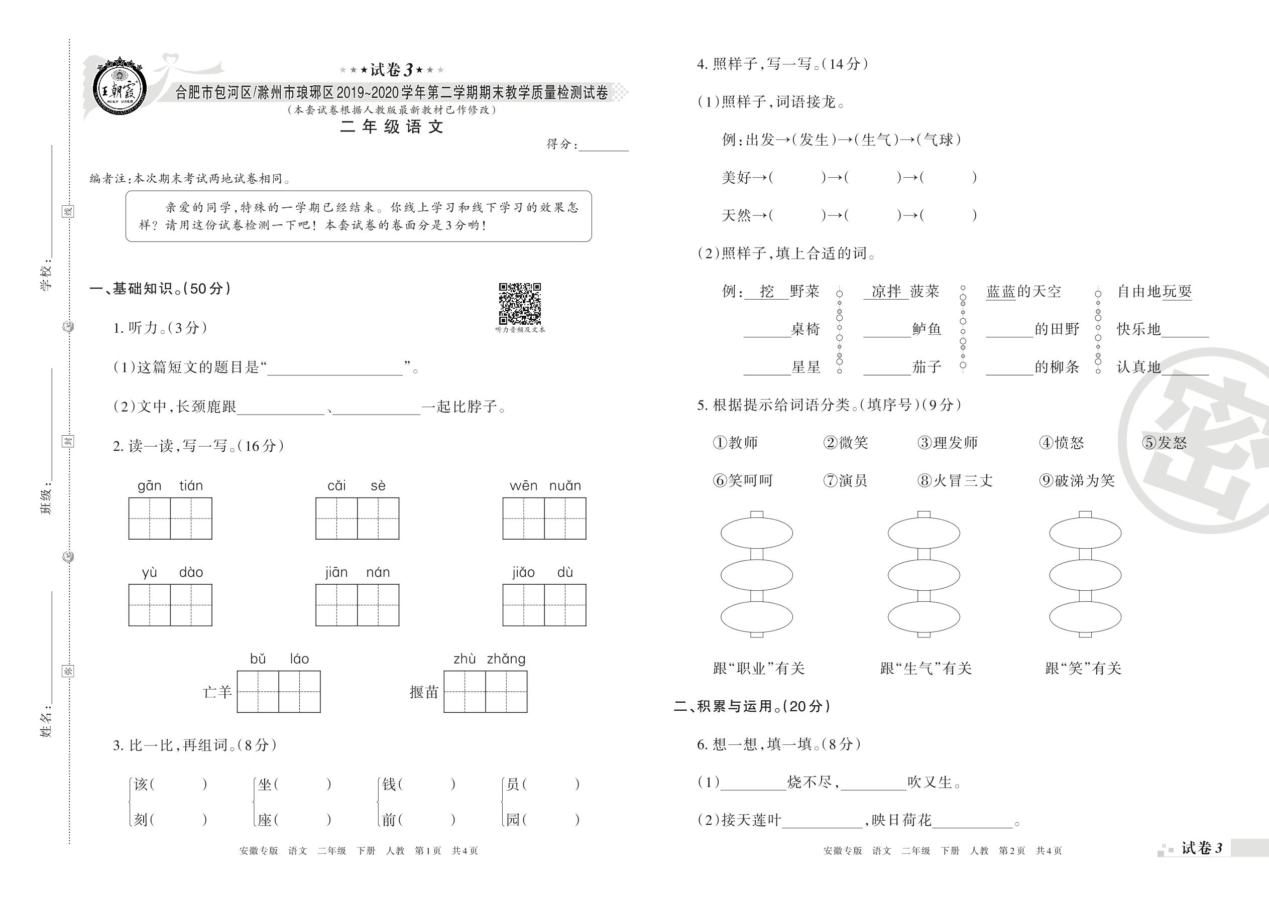 2019-2020学年第二学期合肥市包河区、滁州市琅琊区二年级语文试卷(人教版)【3】