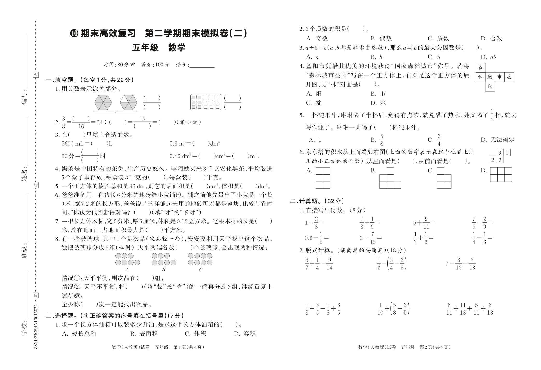 2023年春下册五年级数学人教版 期末高效复习 第二学期期末模拟卷(二)