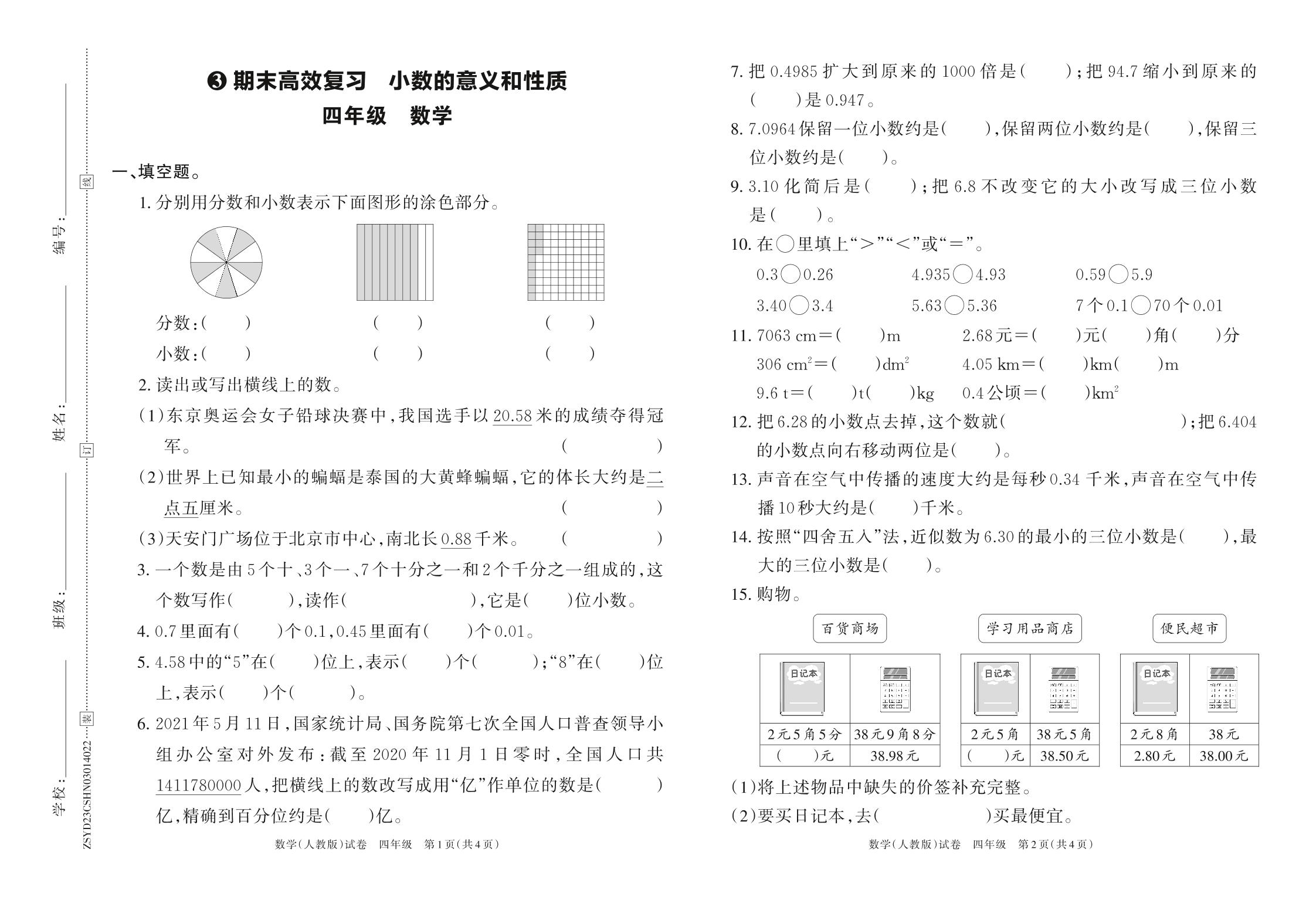 2023年春下册四年级数学人教版 期末高效复习 小数的意义和性质
