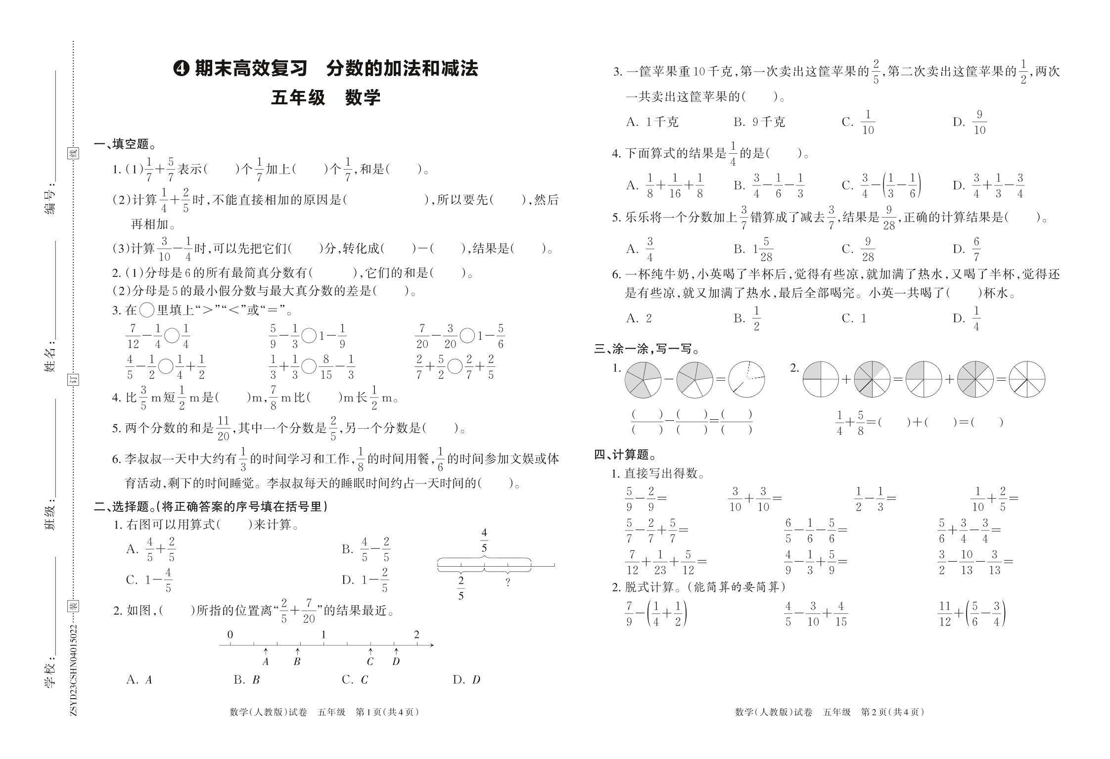 2023年春下册五年级数学人教版 期末高效复习 分数的加法和减法