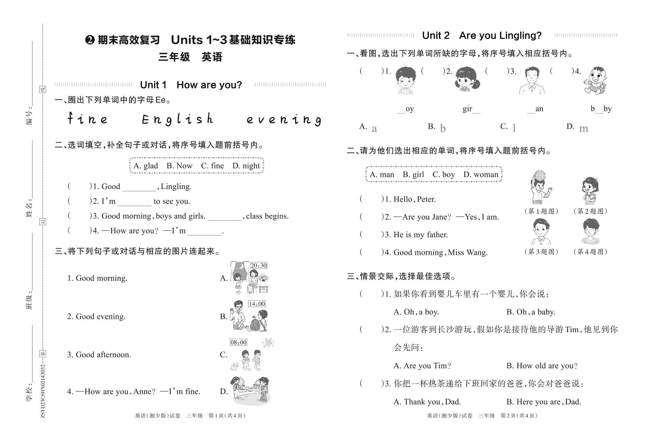 2023年春下册三年级英语湘少版 期末高效复习 Units 1~3基础知识专练