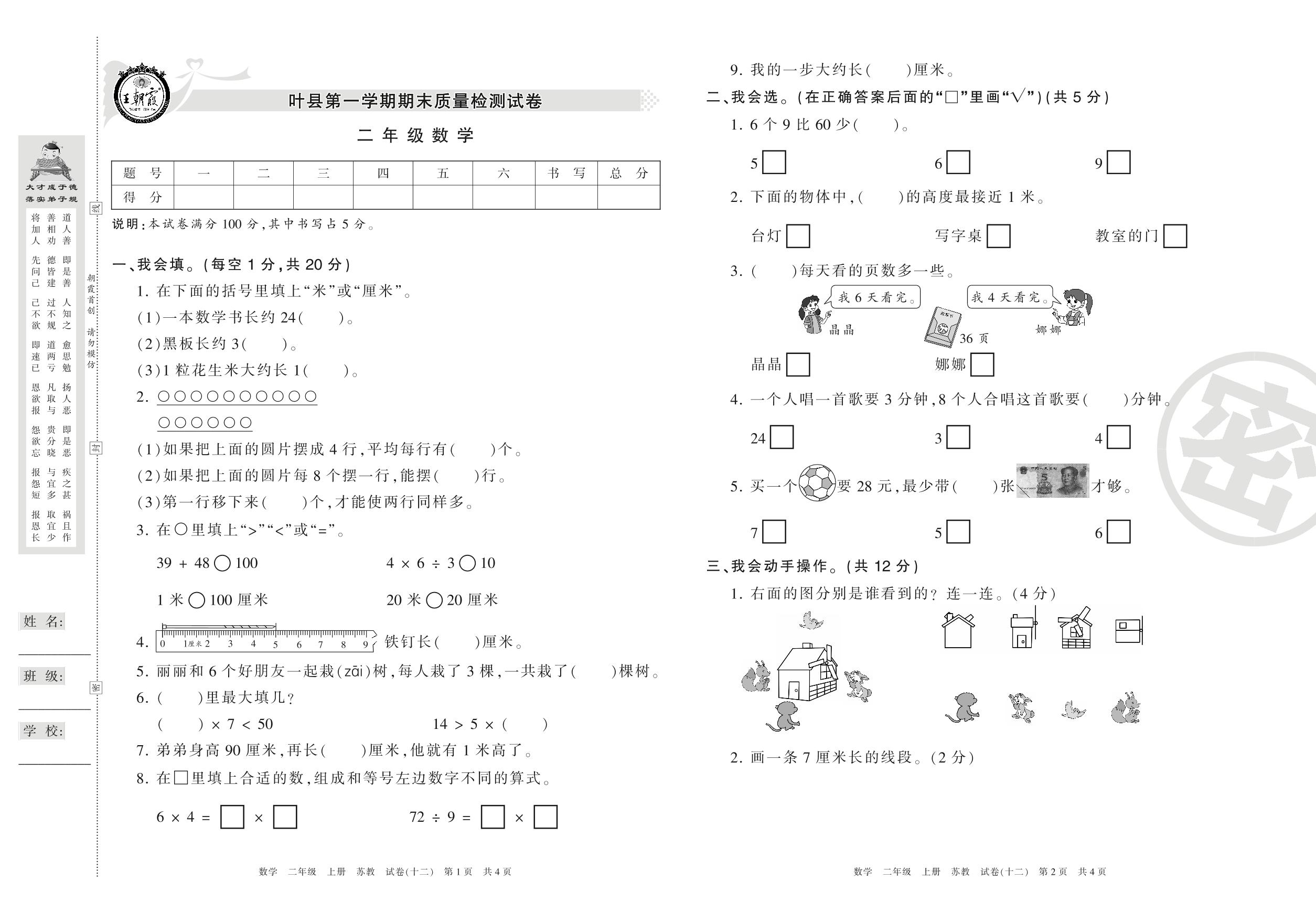 2016-2017学年第一学期平顶山市叶县二年级数学试卷(苏教版)【12】