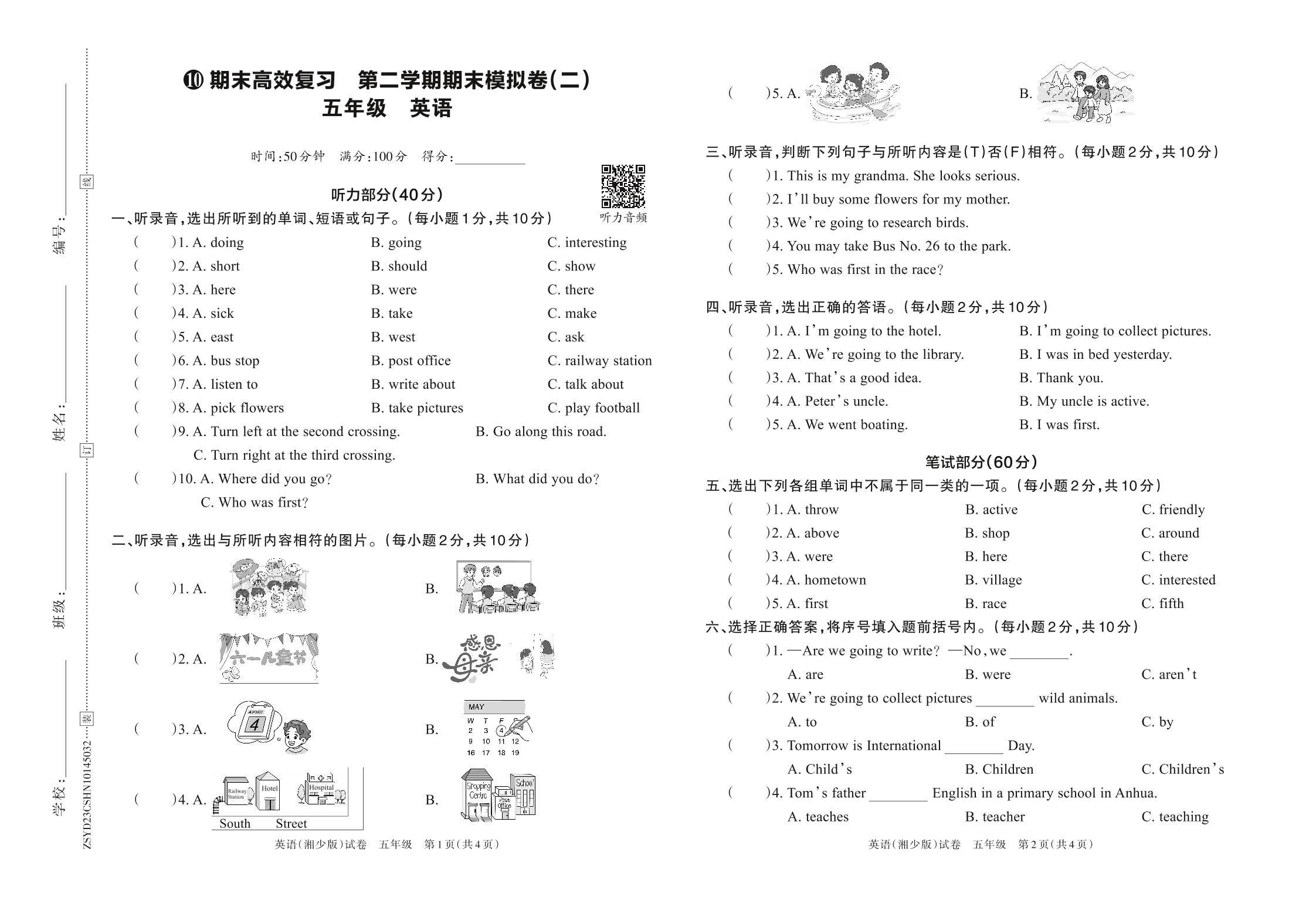 2023年春下册五年级英语湘少版 期末高效复习 第二学期期末模拟卷(二)