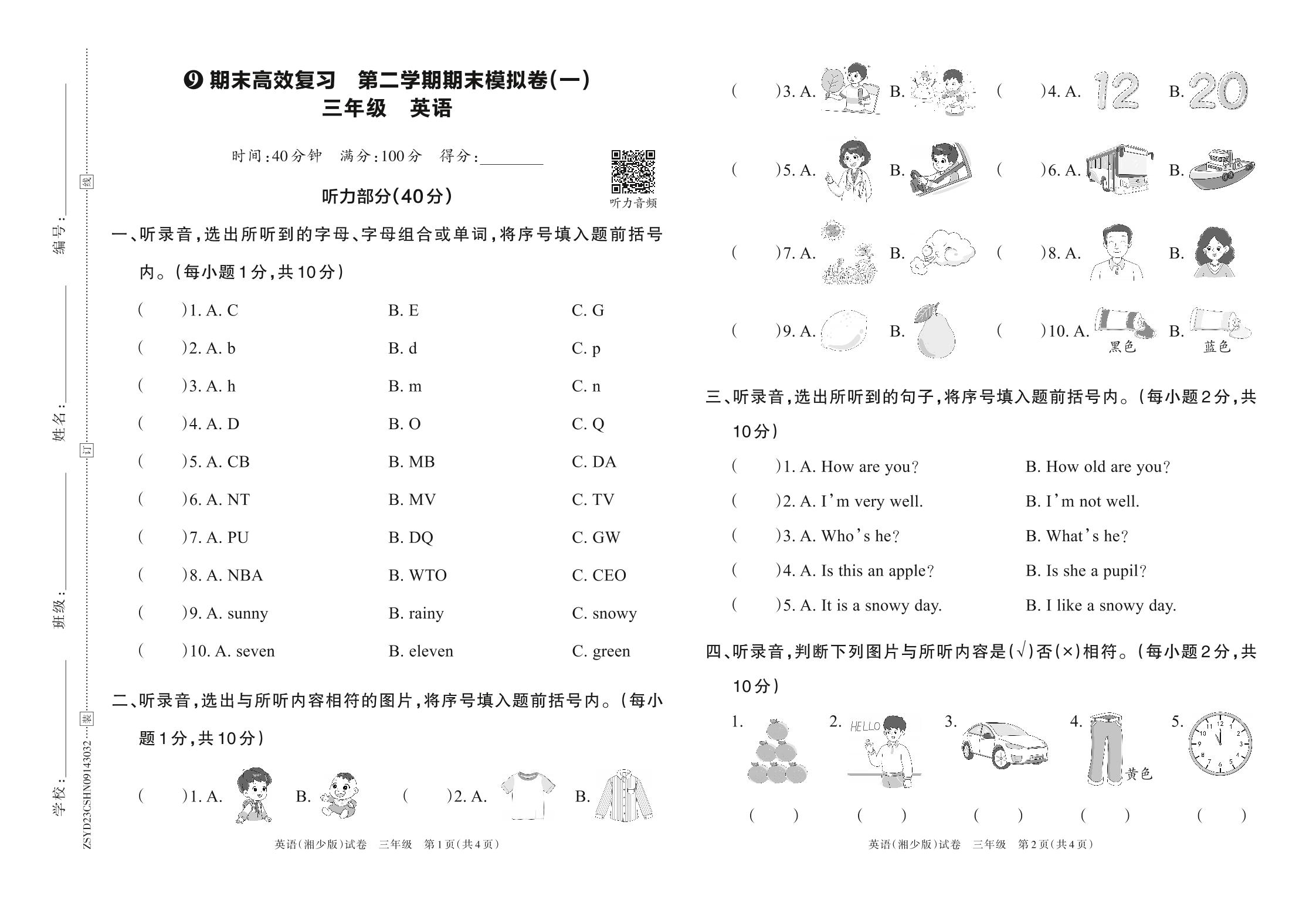 2023年春下册三年级英语湘少版 期末高效复习 第二学期期末模拟卷(一)
