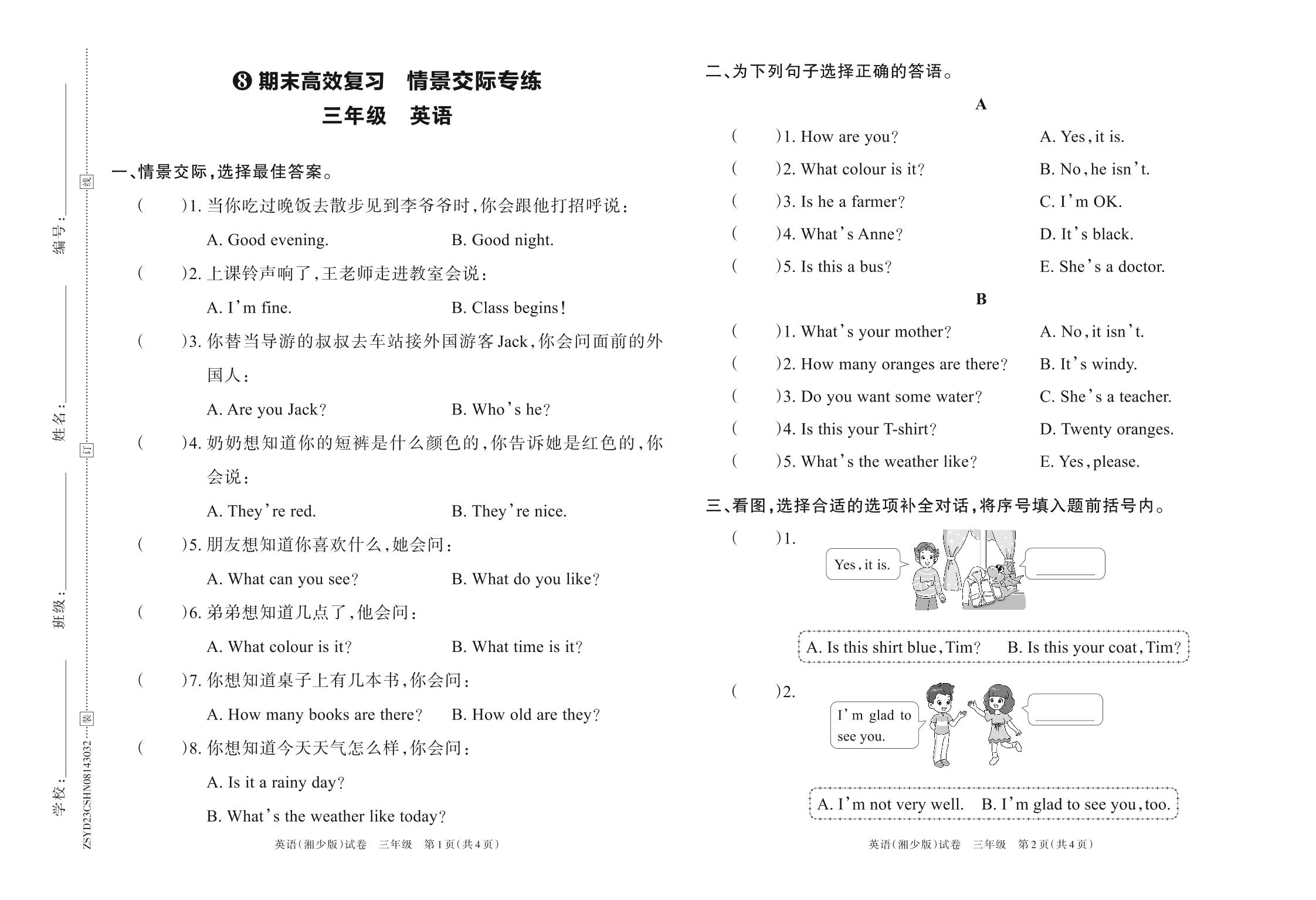 2023年春下册三年级英语湘少版 期末高效复习 情景交际专练