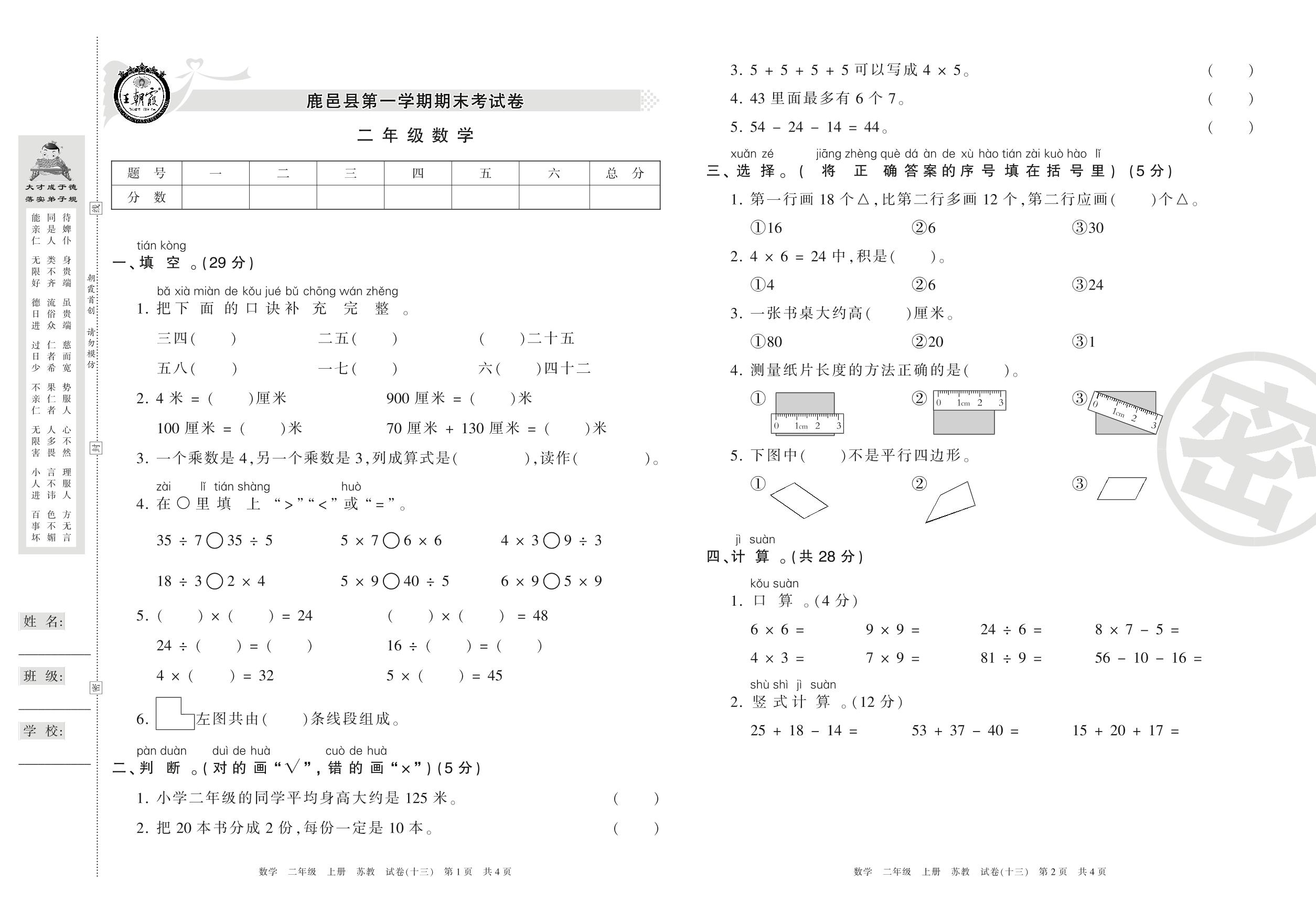 2016-2017学年第一学期周口市鹿邑县二年级数学试卷(苏教版)【13】