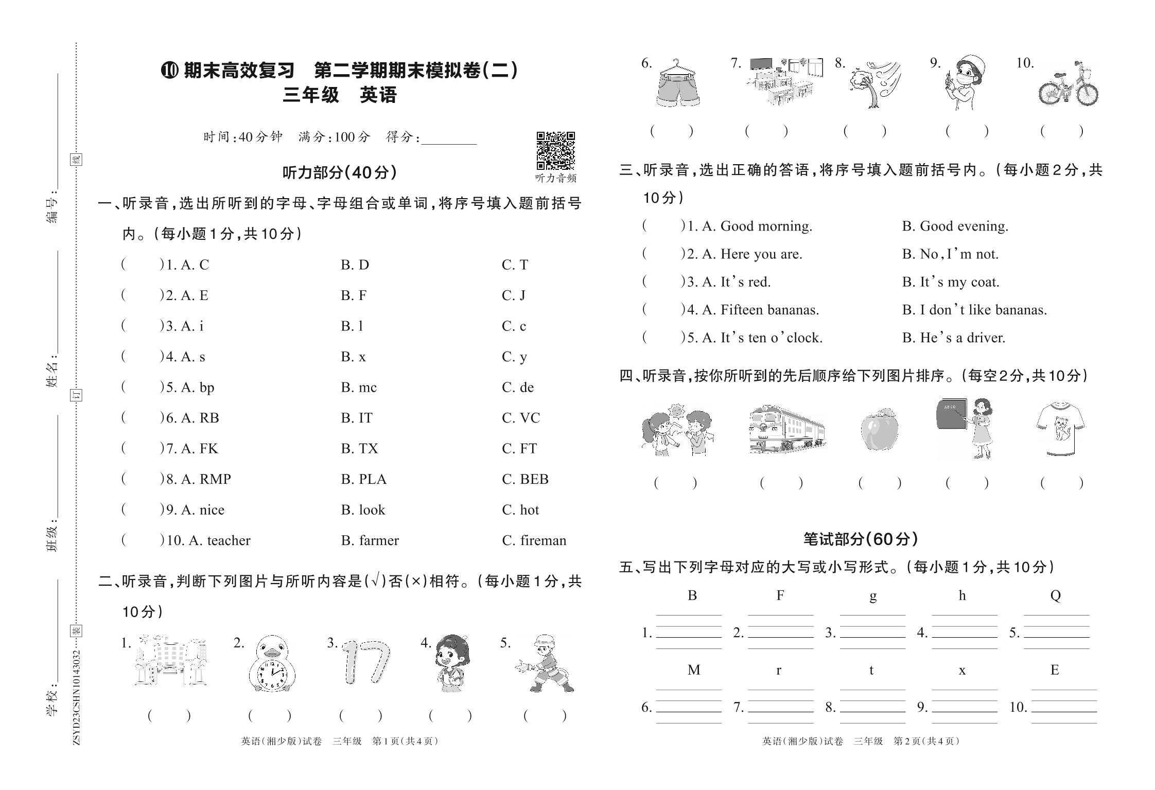 2023年春下册三年级英语湘少版 期末高效复习 第二学期期末模拟卷(二)