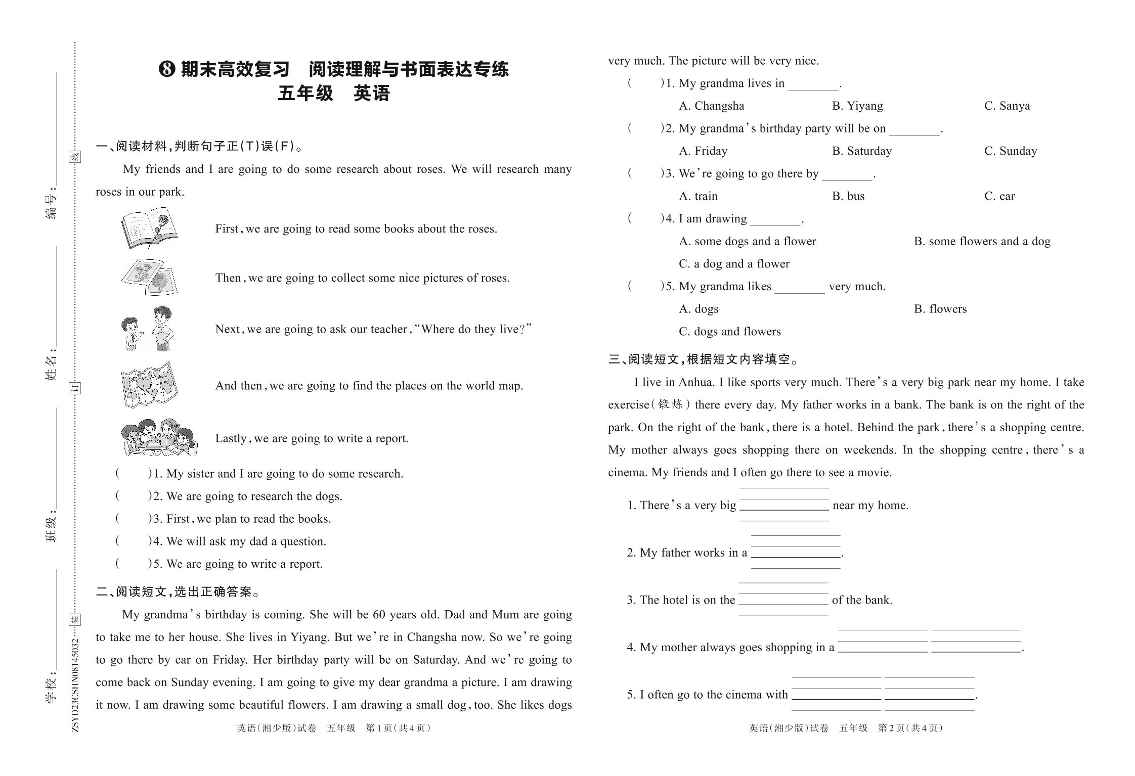 2023年春下册五年级英语湘少版 期末高效复习 阅读理解余书面表达专练