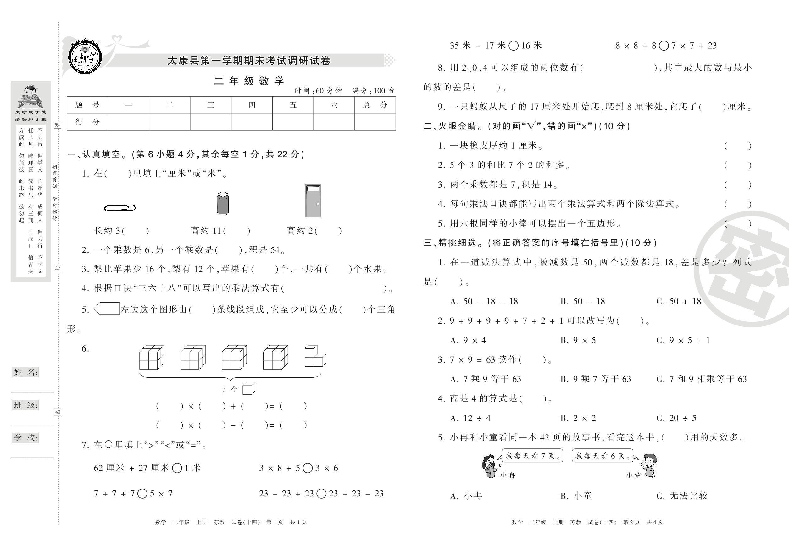2016-2017学年第一学期周口市太康县二年级数学试卷(苏教版)【14】