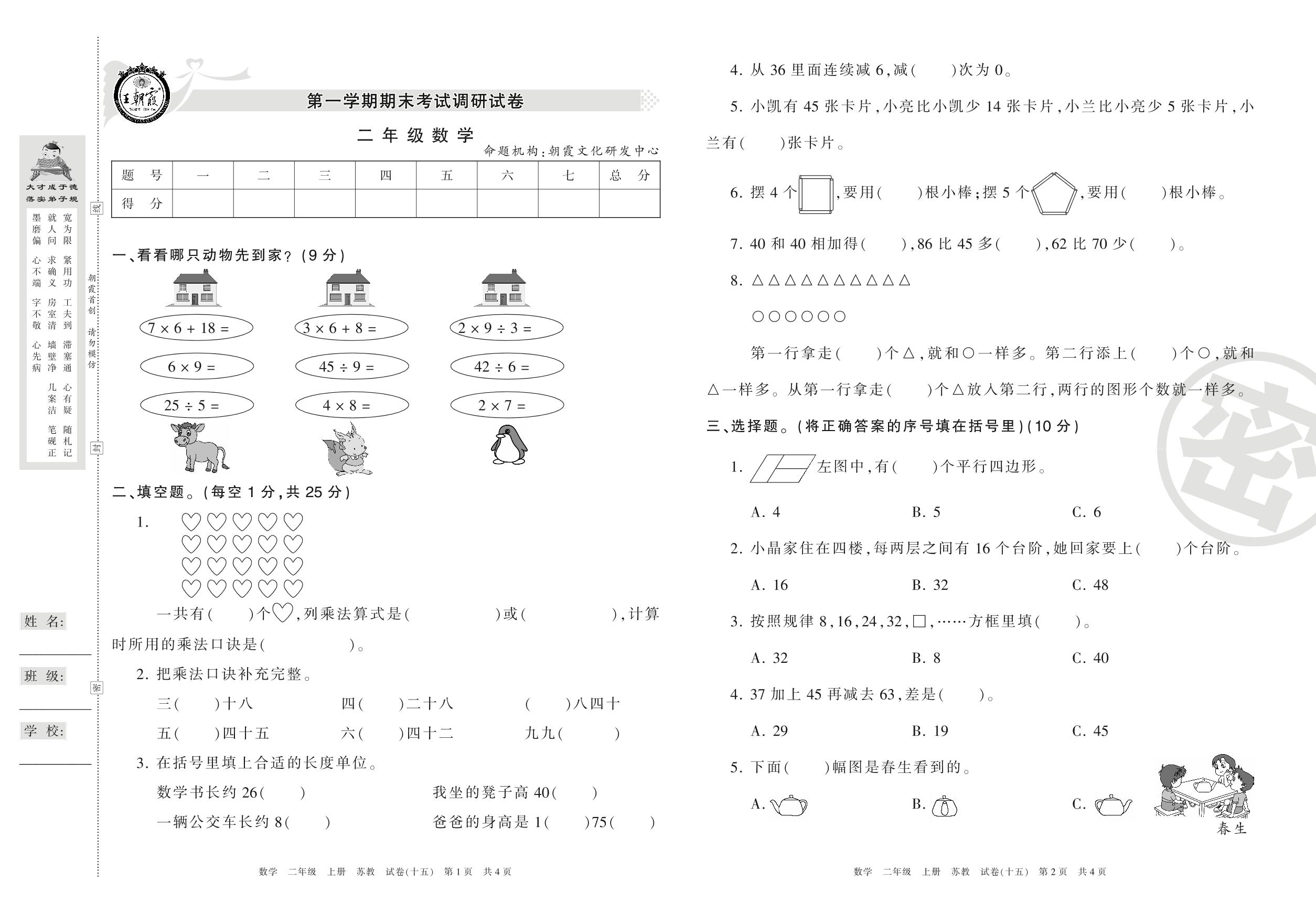 王朝霞期末调研卷二年级上册数学(苏教版)【15】