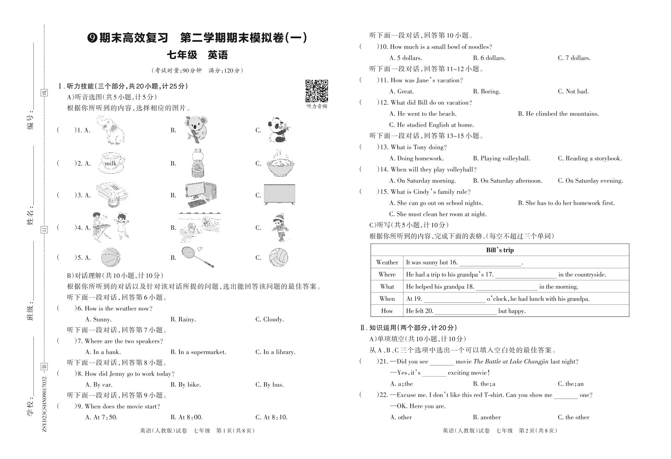 2023年春下册七年级英语人教版 期末高效复习 第二学期期末模拟卷(一)