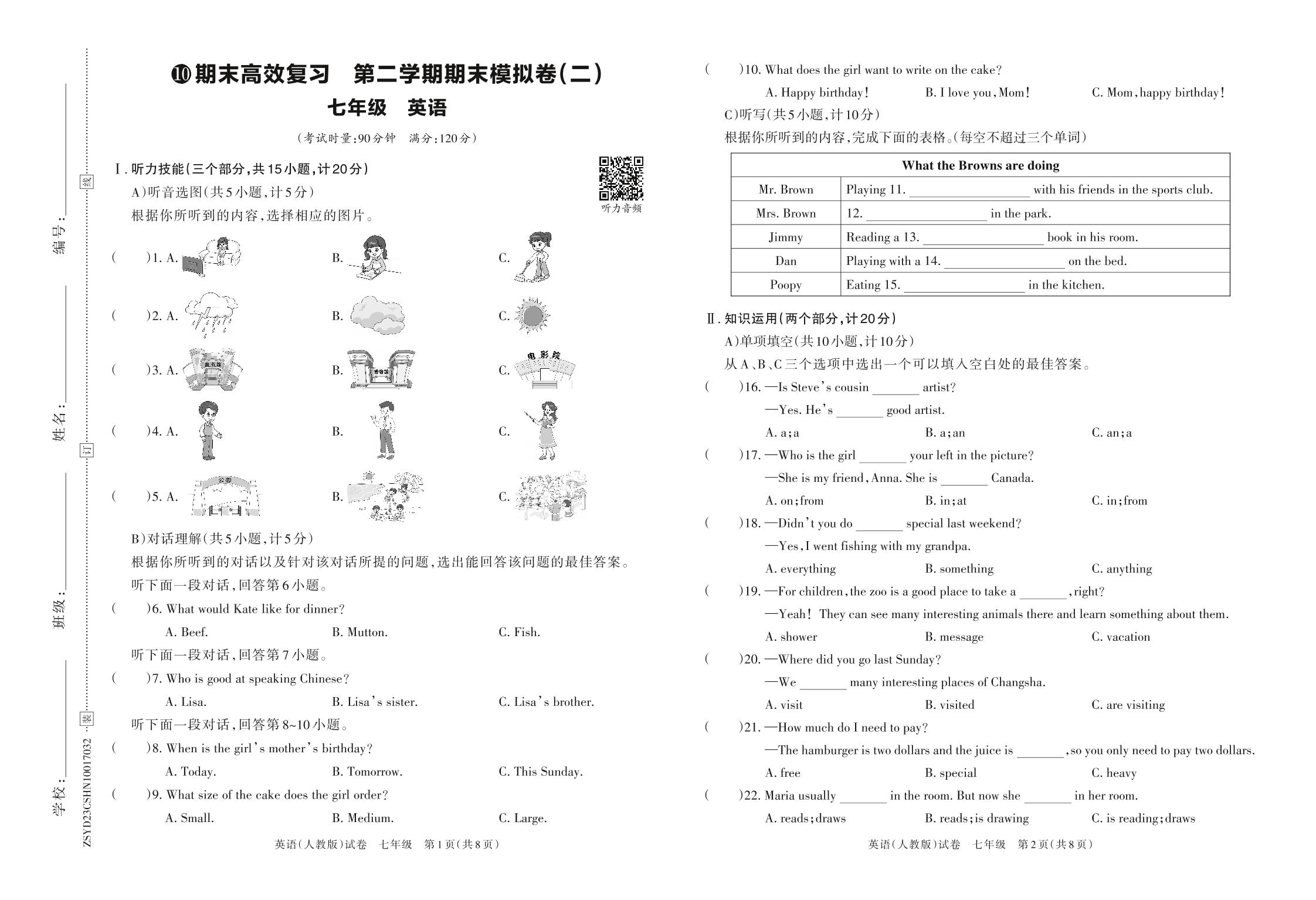 七年级英语人教版下册期末卷