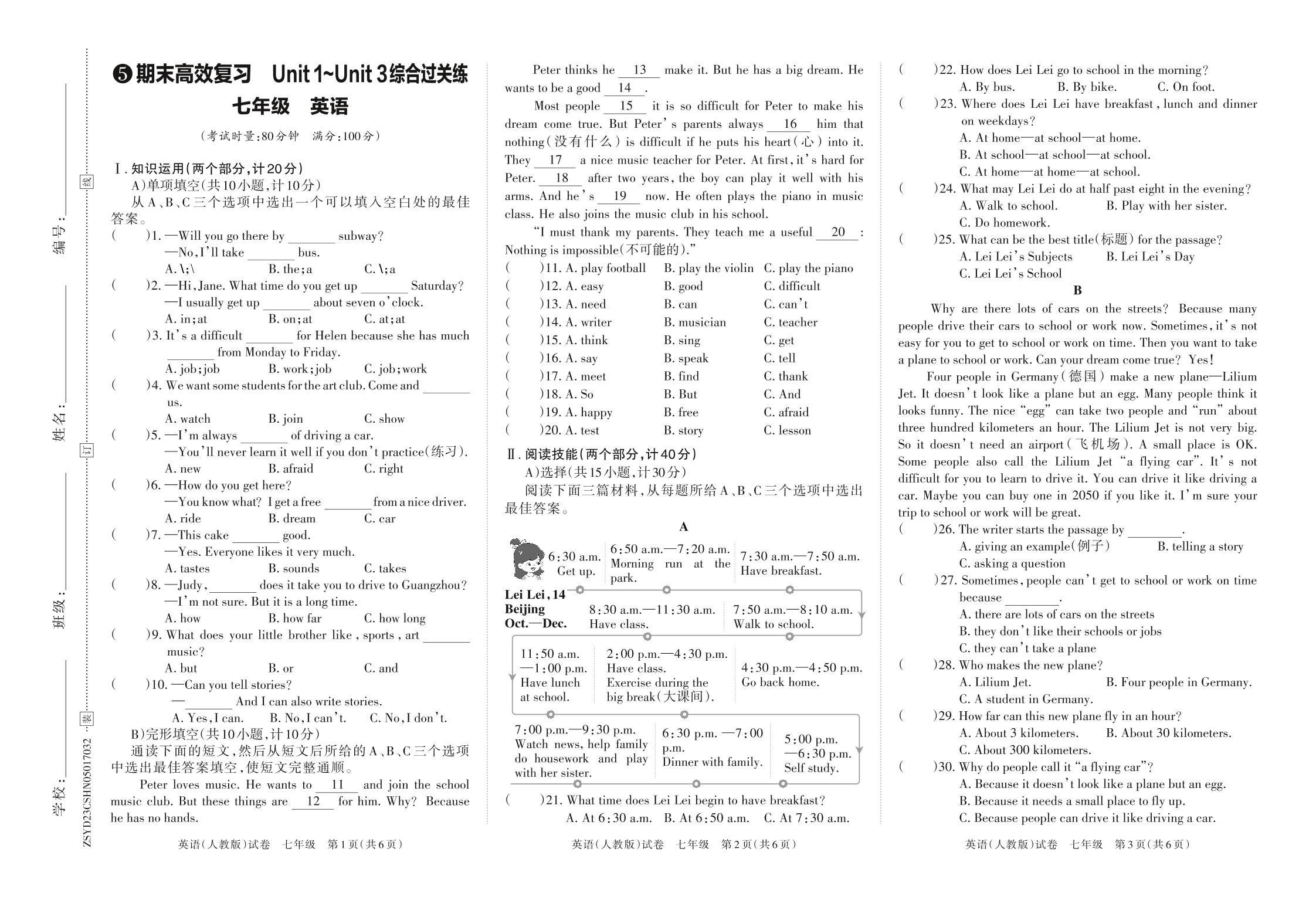 2023年春下册七年级英语人教版 期末高效复习 Unit 1~Unit 3 综合过关练