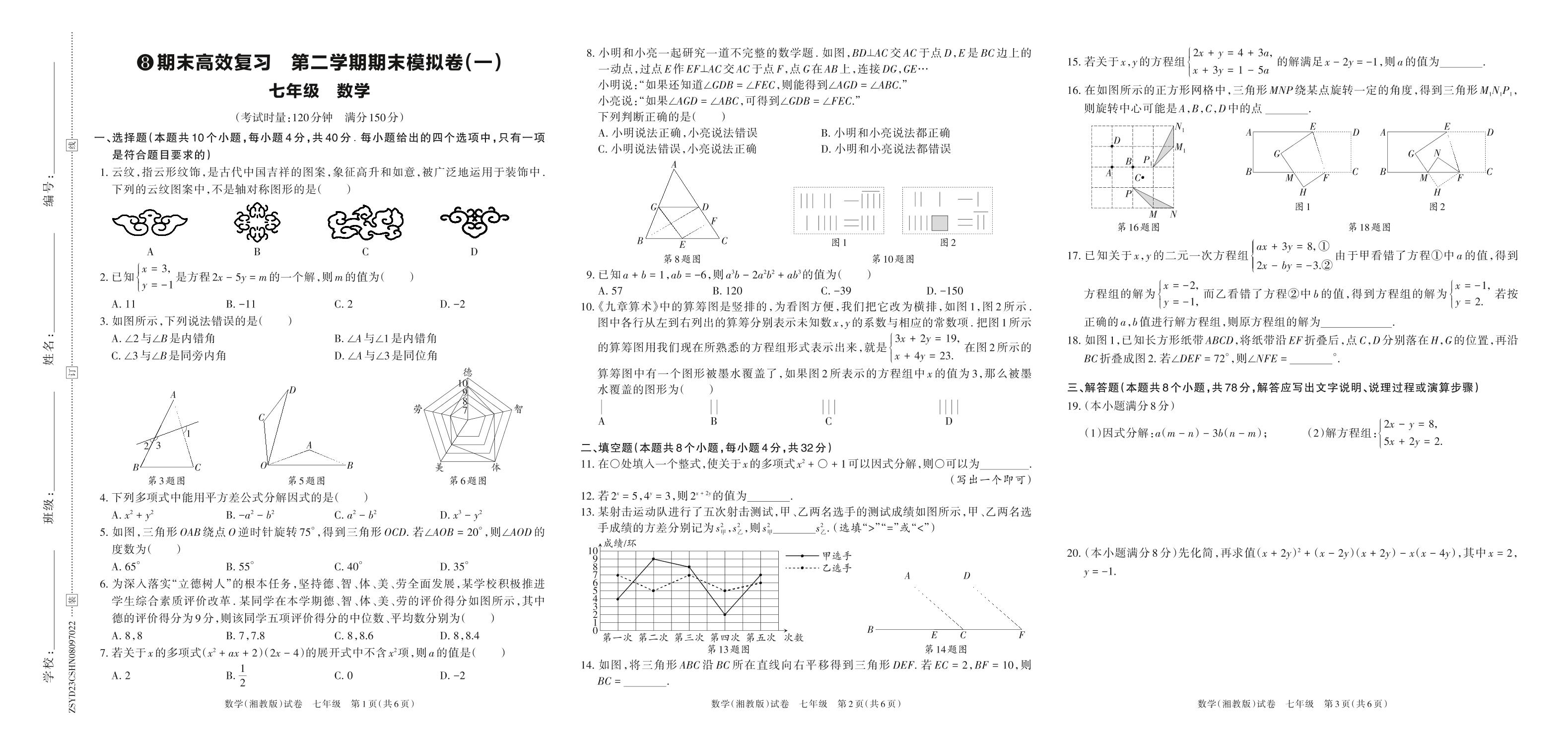 2023年春下册七年级数学湘教版 期末高效复习 第二学期期末模拟卷(一)