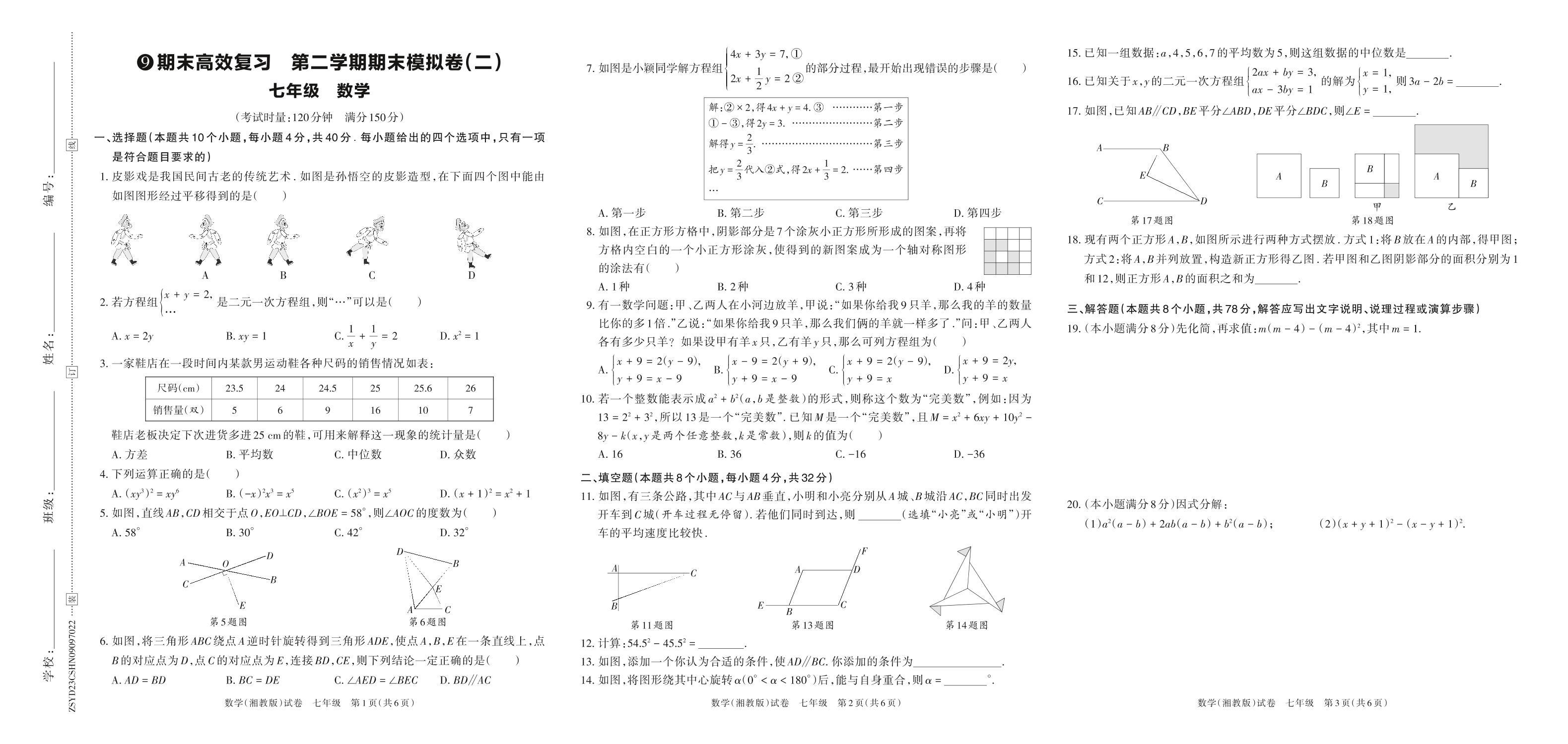 2023年春下册七年级数学湘教版 期末高效复习 第二学期期末模拟卷(二)