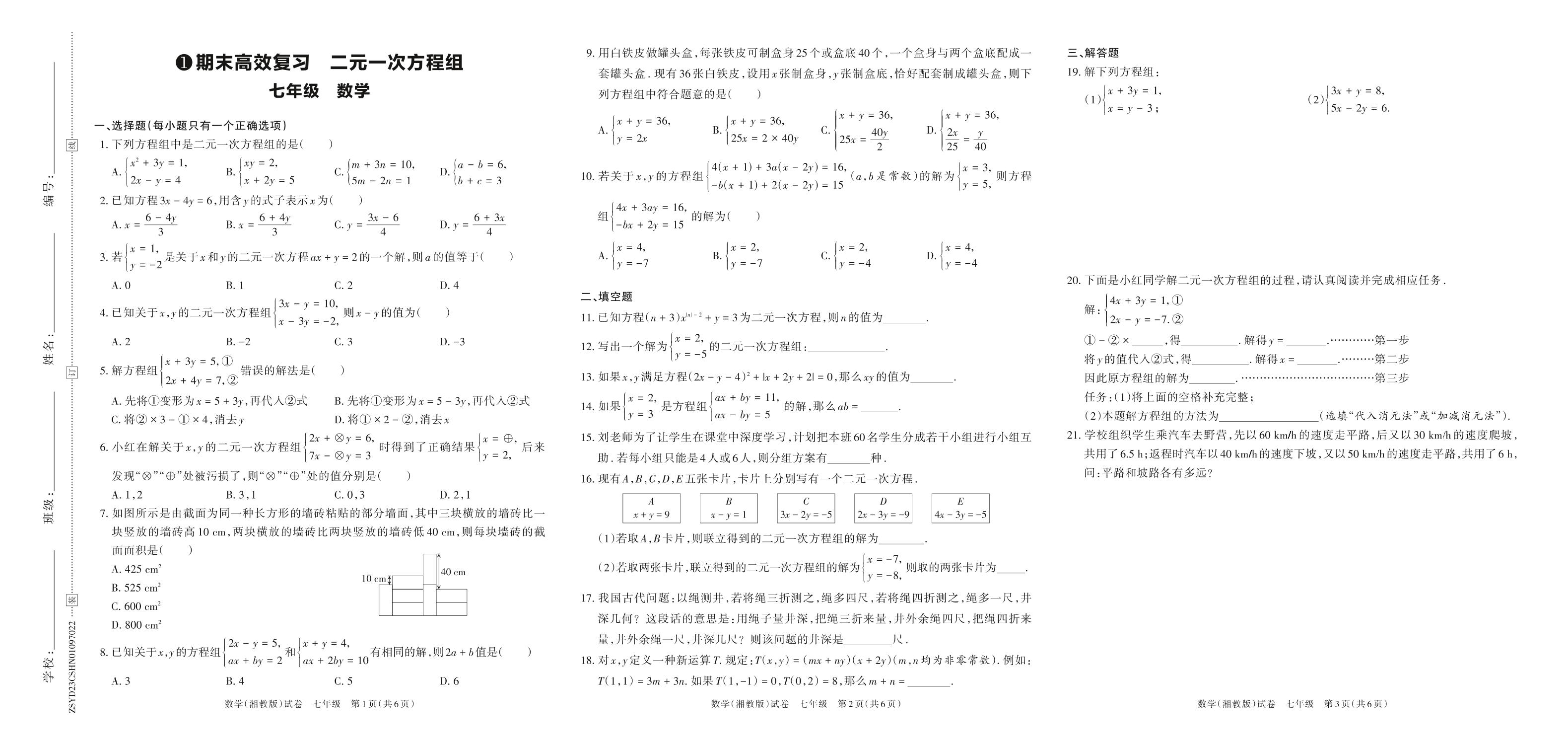 2023年春下册七年级数学湘教版 期末高效复习 二元一次方程组