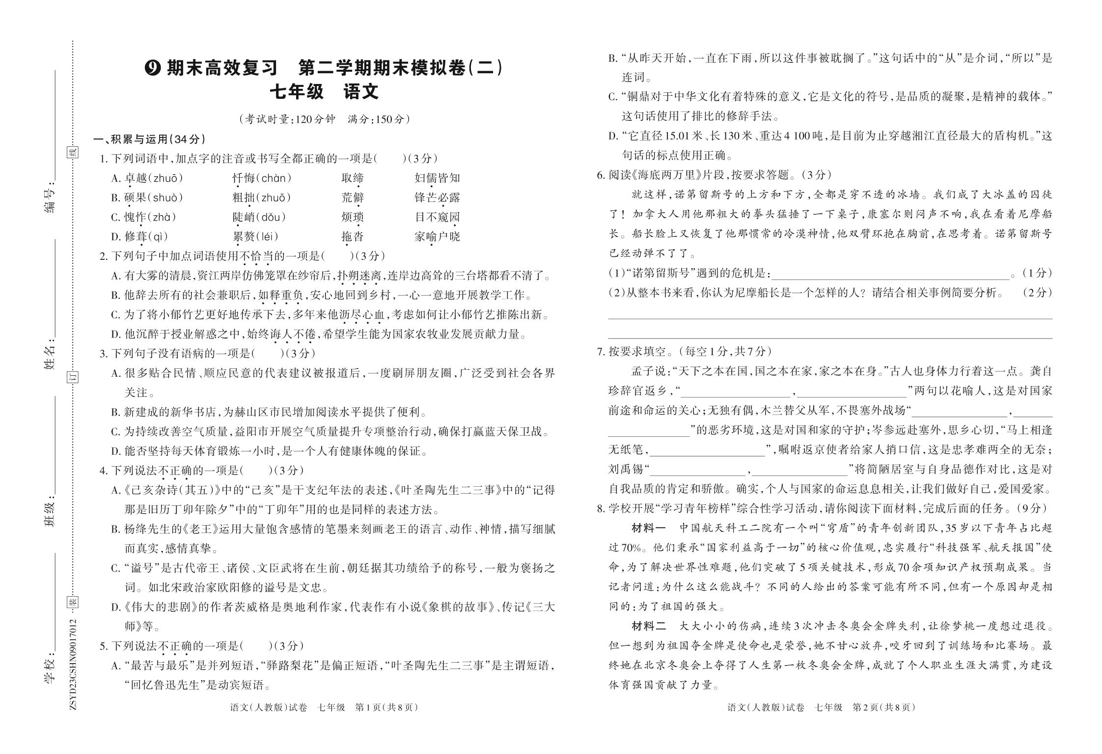 2023年春下册七年级语文人教版 期末高效复习 第二学期期末模拟卷(二)