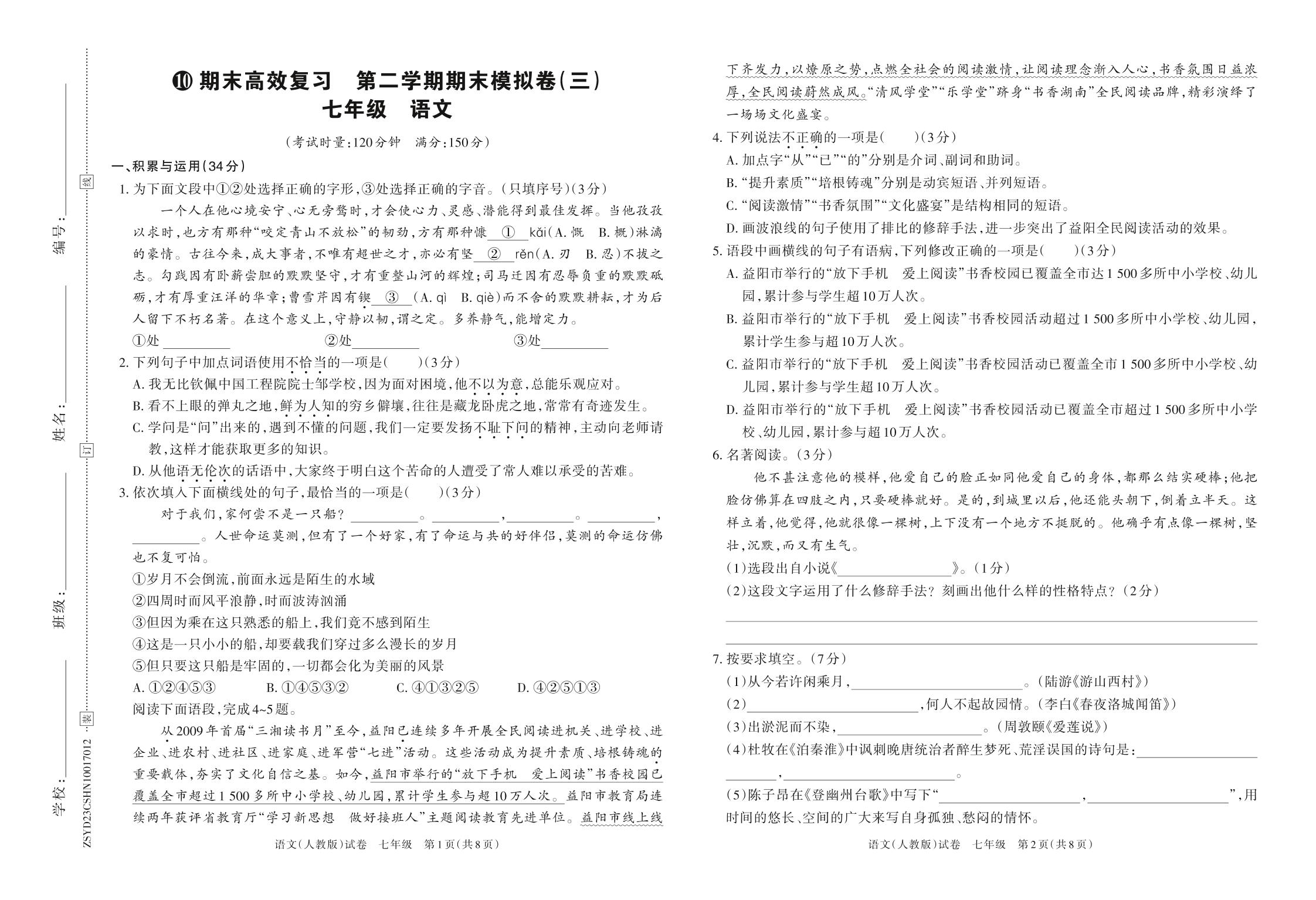 2023年春下册七年级语文人教版 期末高效复习 第二学期期末模拟卷(三)