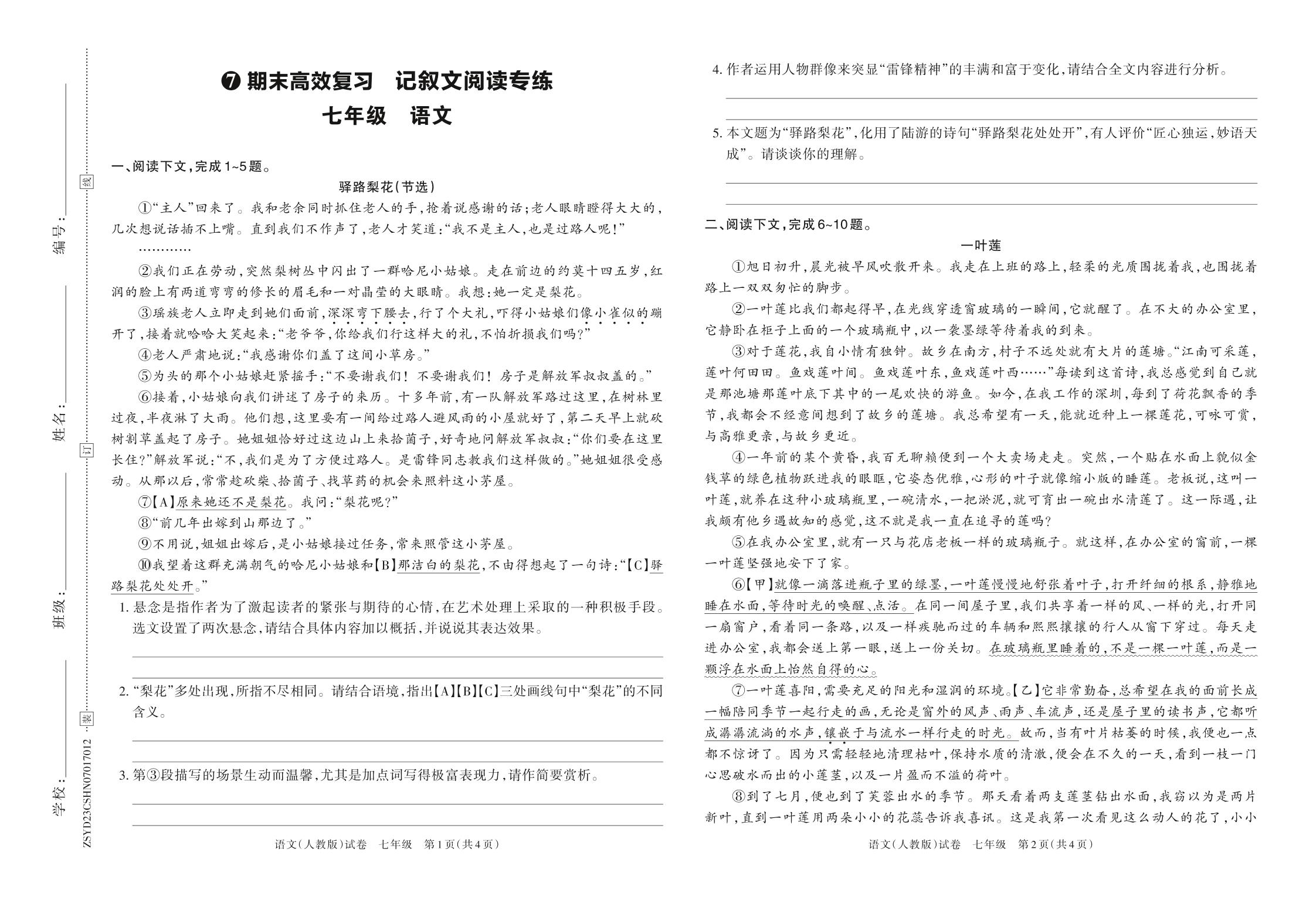 2023年春下册七年级语文人教版 期末高效复习 记叙文阅读专练