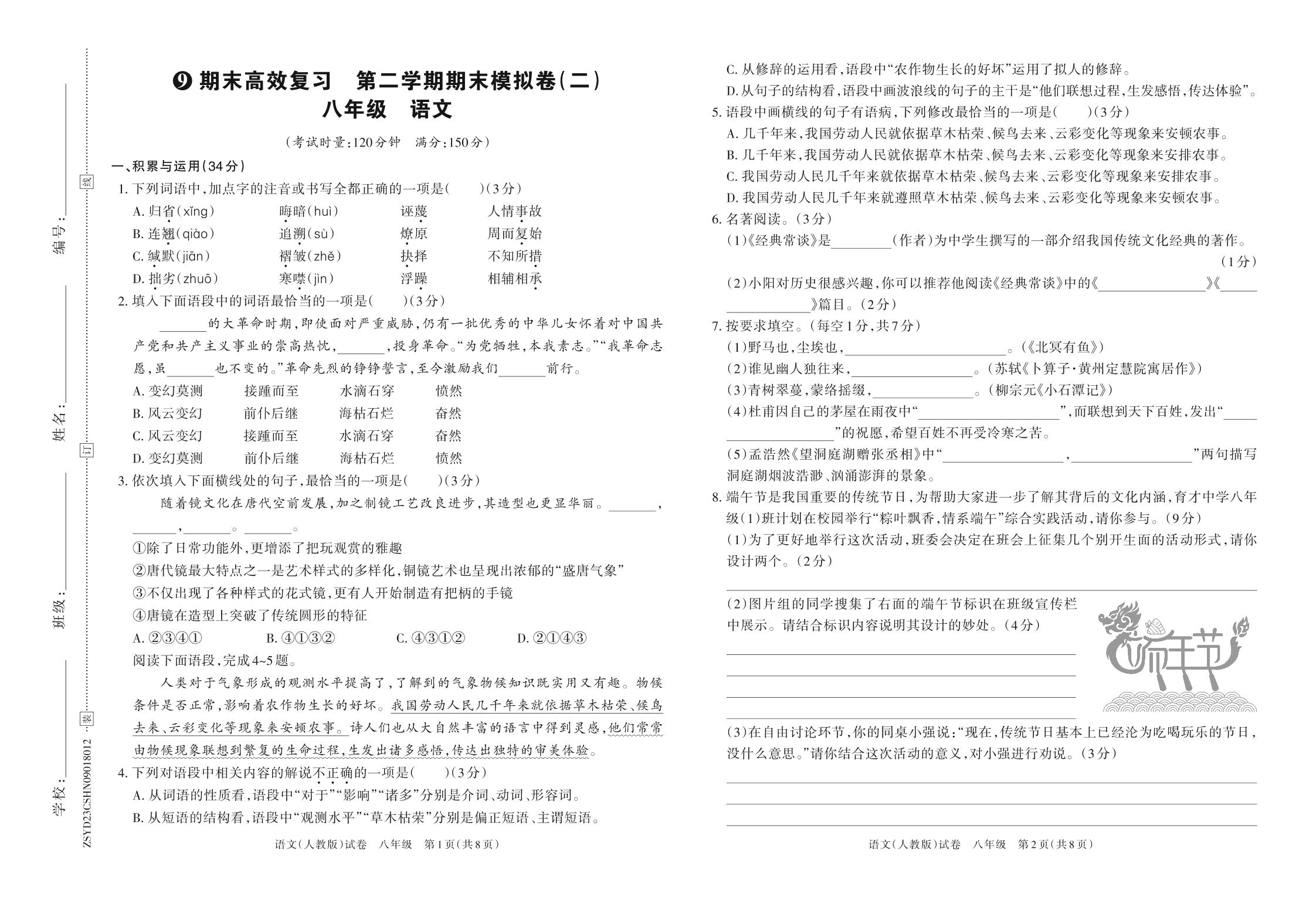 2023年春下册八年级语文人教版 期末高效复习 第二学期期末模拟卷(二)
