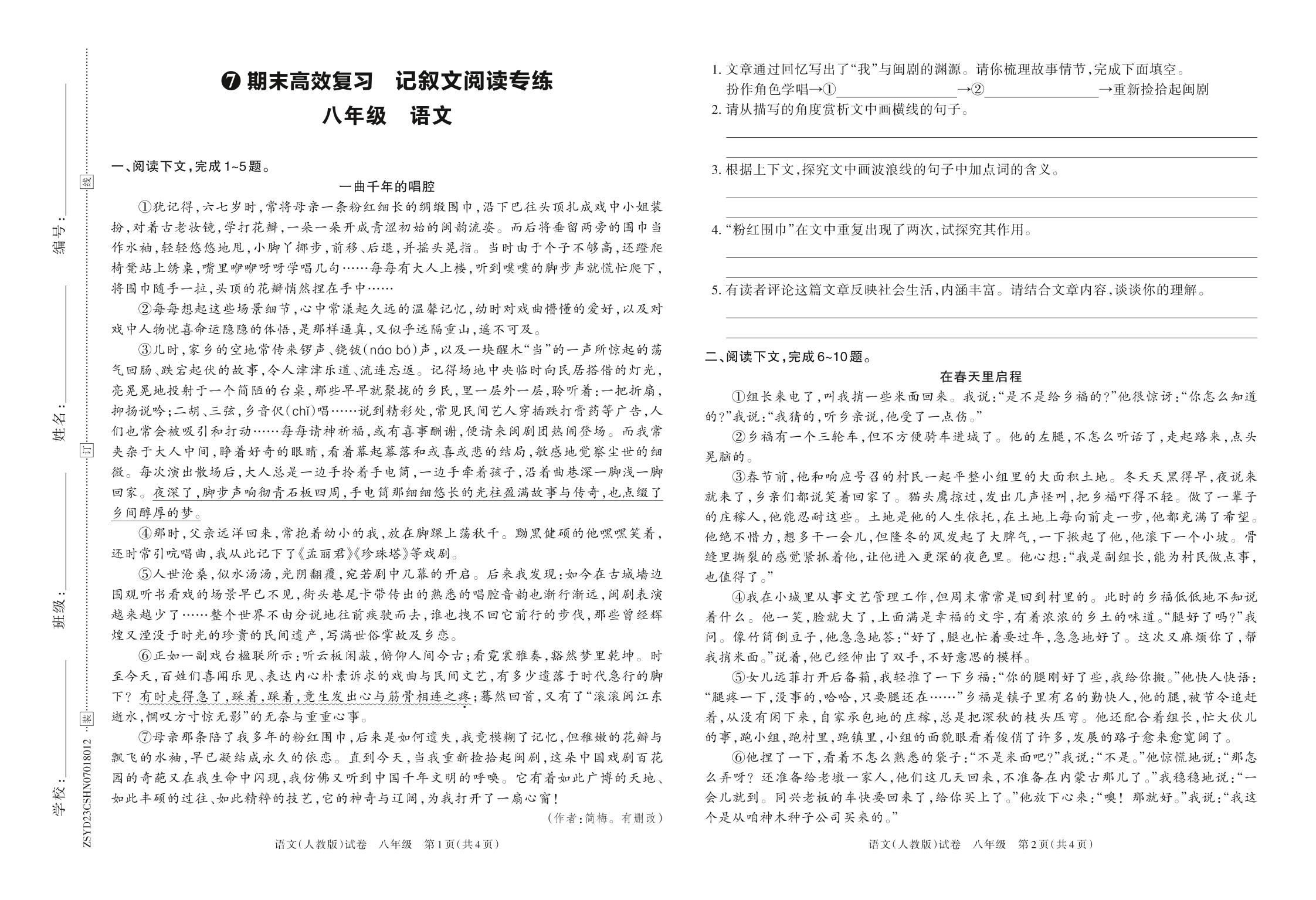 2023年春下册八年级语文人教版 期末高效复习 记叙文阅读专练
