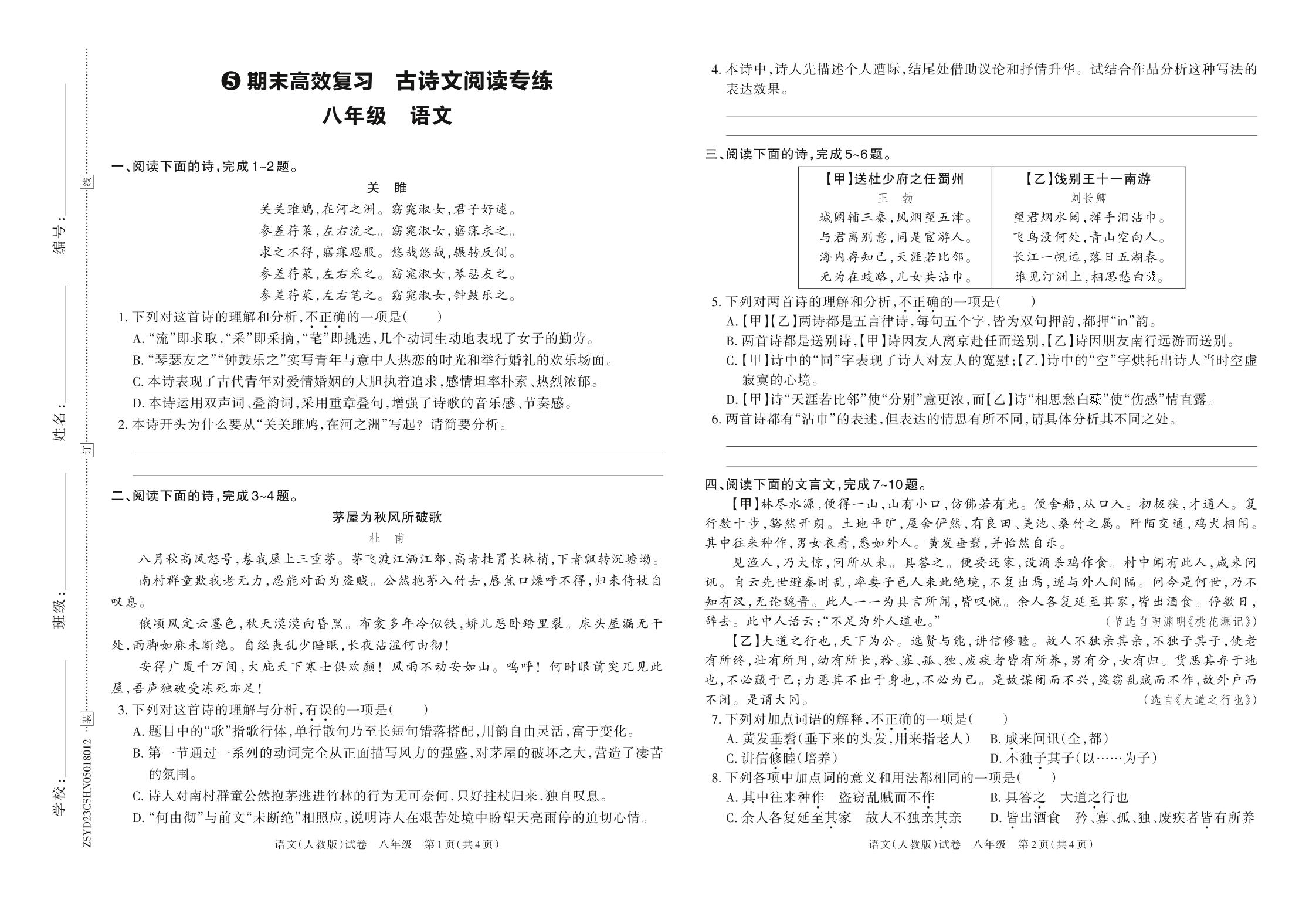 2023年春下册八年级语文人教版 期末高效复习 古诗文阅读专练