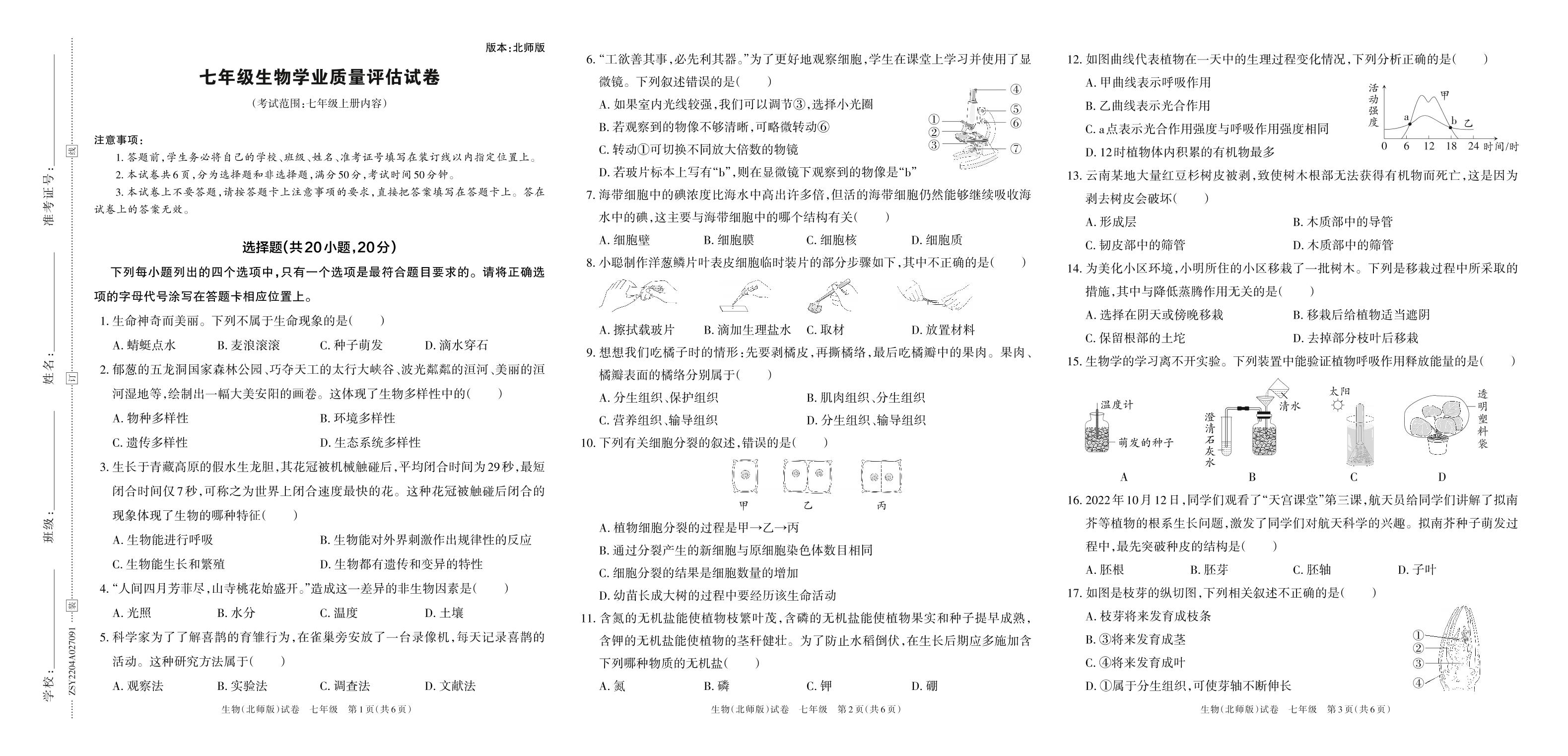 河南省安阳市安阳县2023春开学学业质量评估试卷七年级生物(北师版)