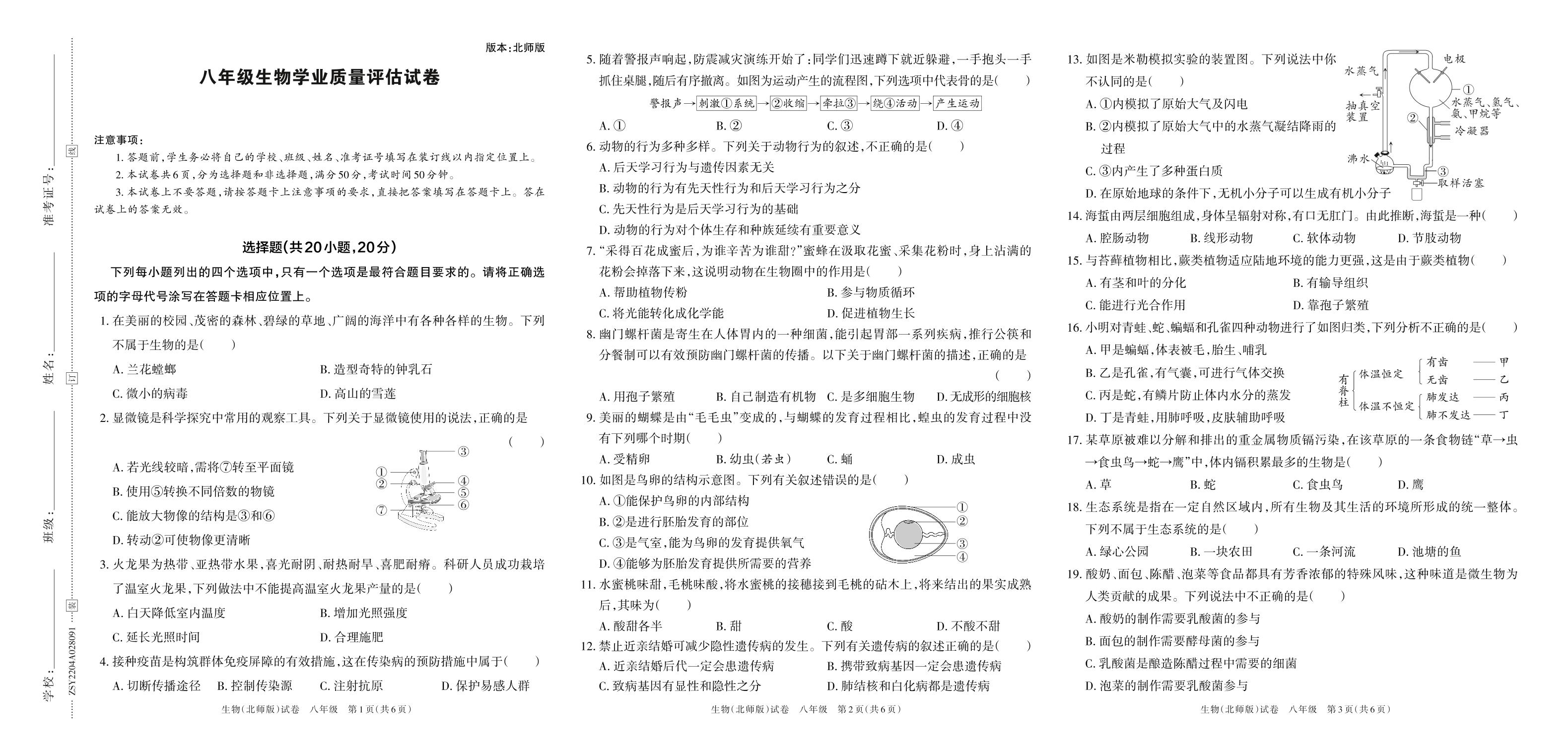 河南省安阳市安阳县2023春开学学业质量评估试卷八年级生物(北师版)