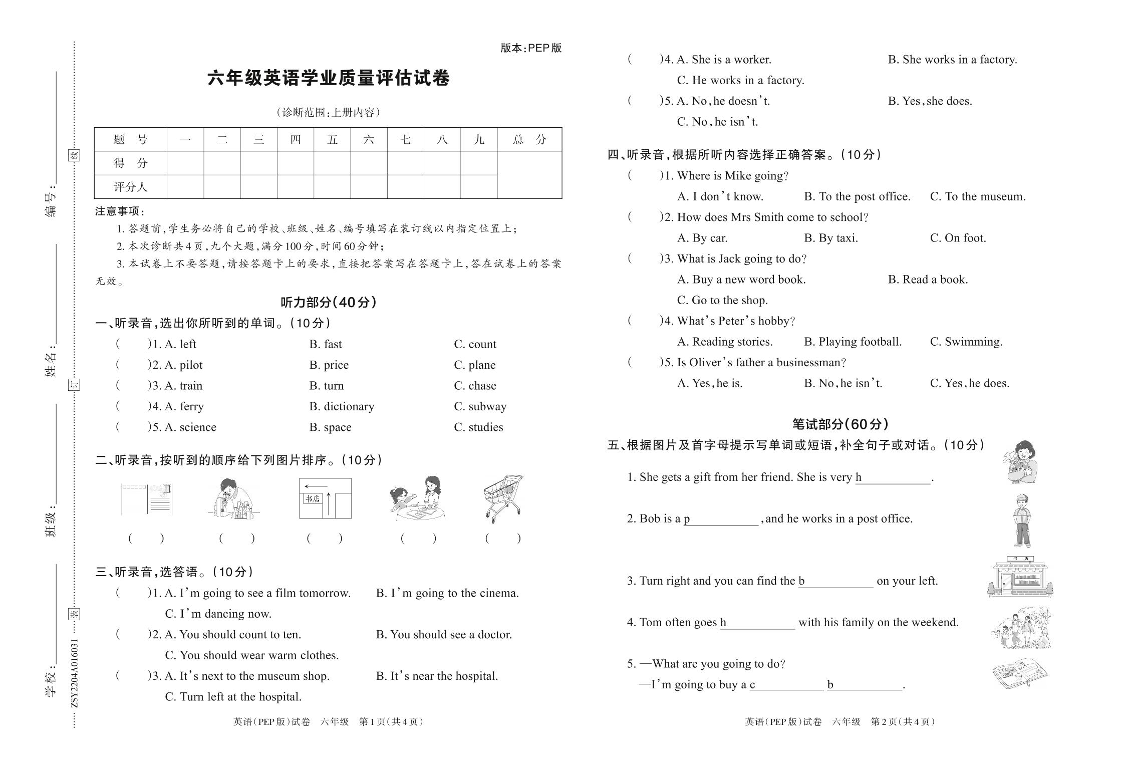 河南省安阳市安阳县2023春开学学业质量评估试卷六年级英语(PEP版)