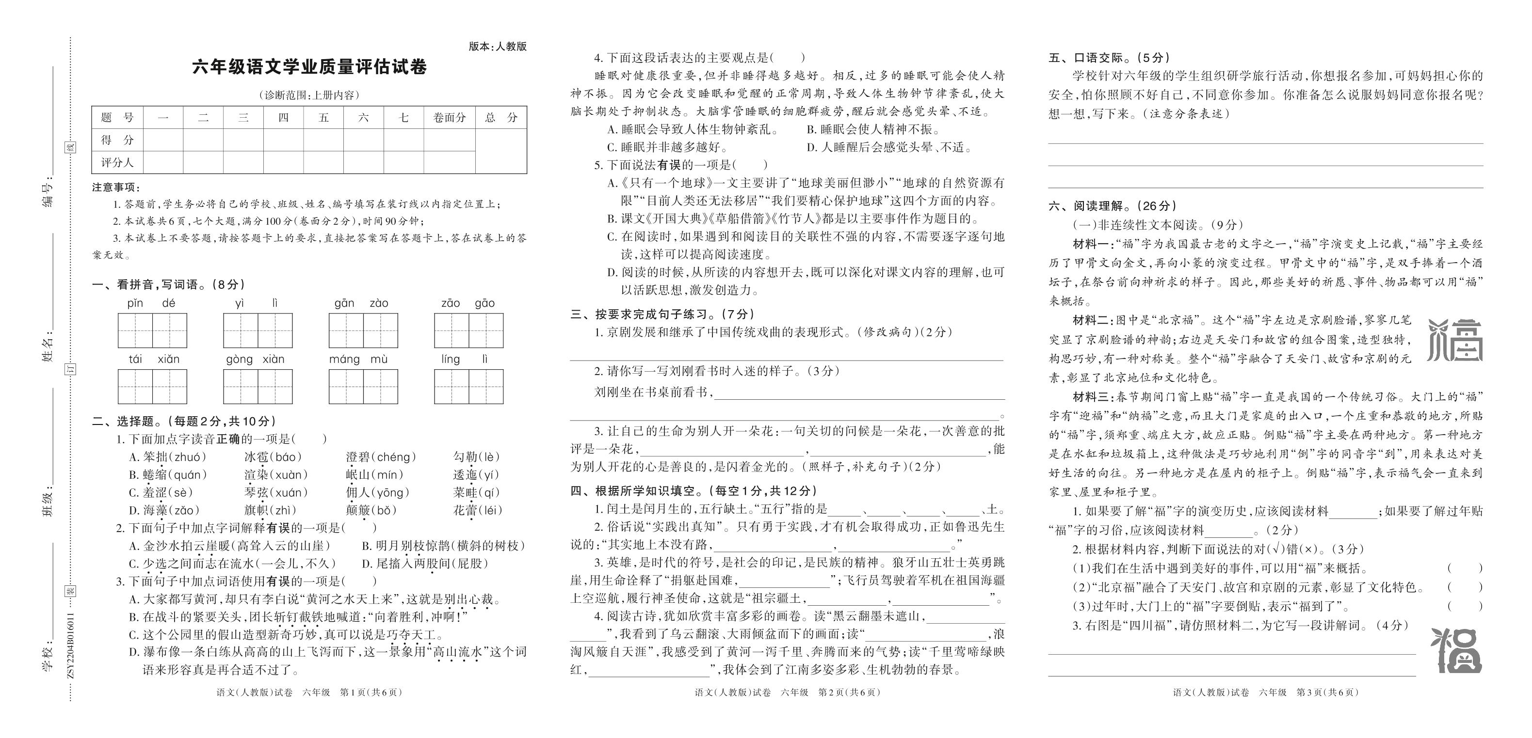 河南省安阳市安阳县2023春开学学业质量评估试卷六年级语文(人教版)