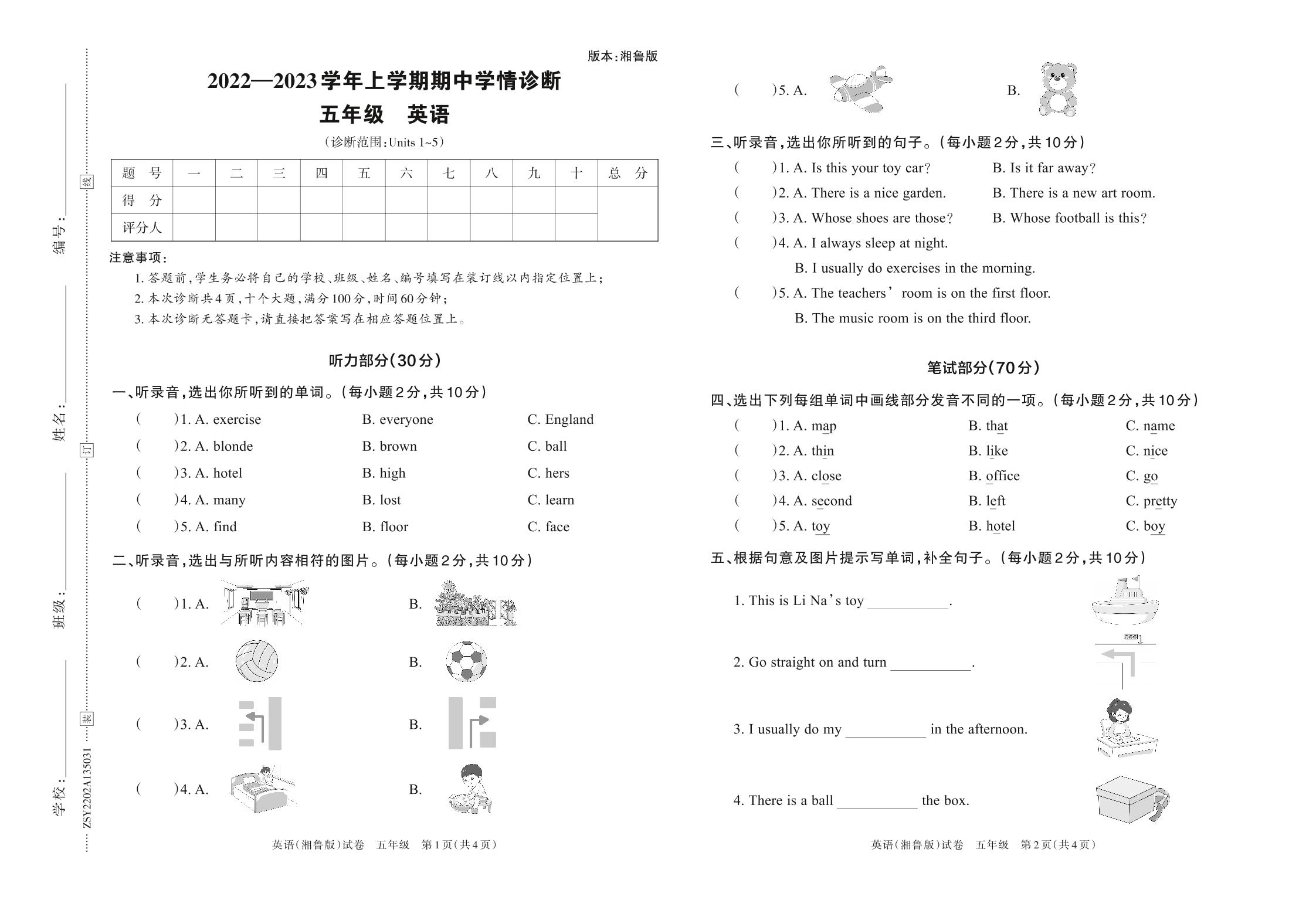 五年级英语湘鲁版上册期中卷
