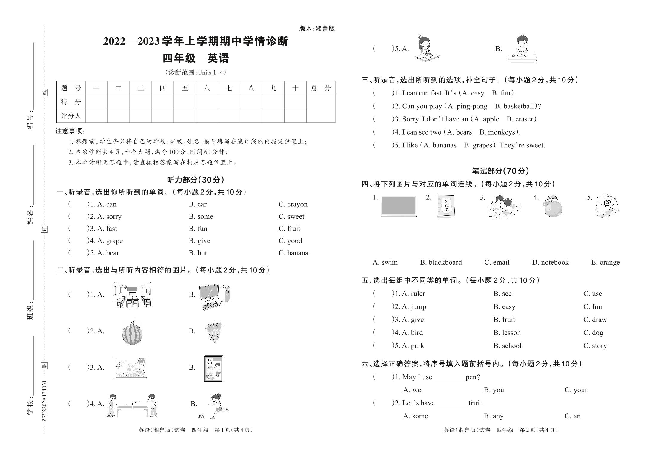 河南省濮阳市清丰县2022—2023学年上学期期中学情诊断试卷四年级英语(湘鲁版)