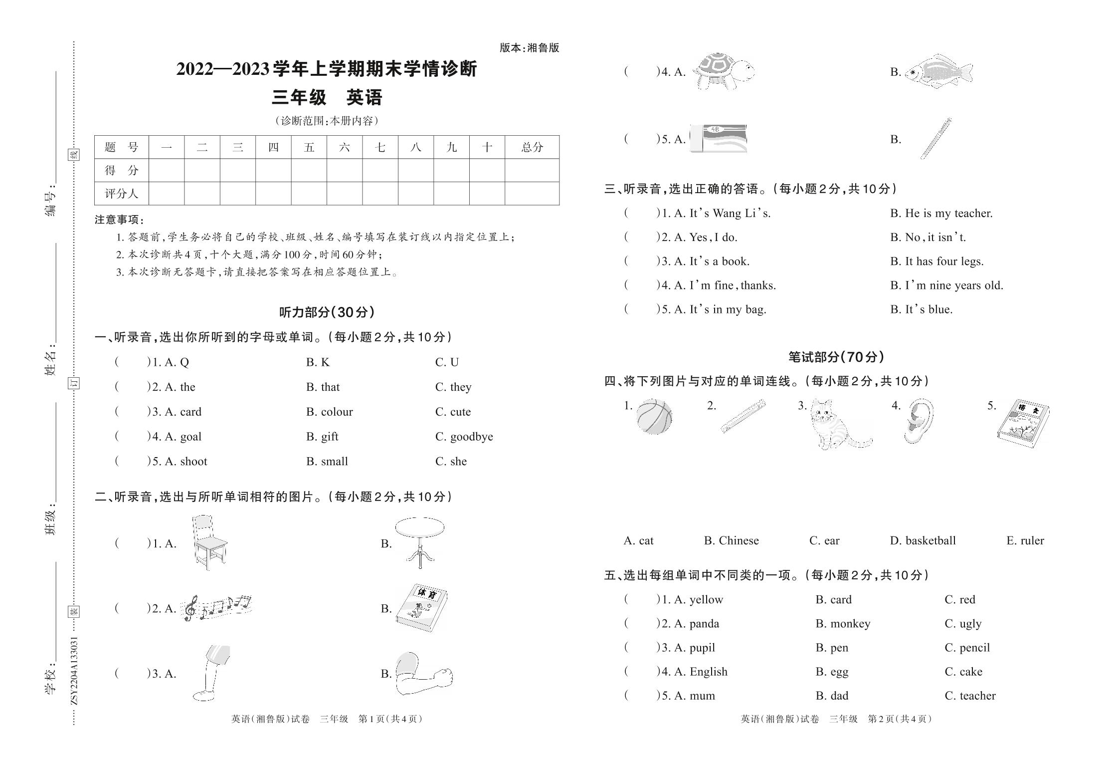 河南省濮阳市清丰县2022—2023学年上学期期末学情诊断试卷三年级英语(湘鲁版)