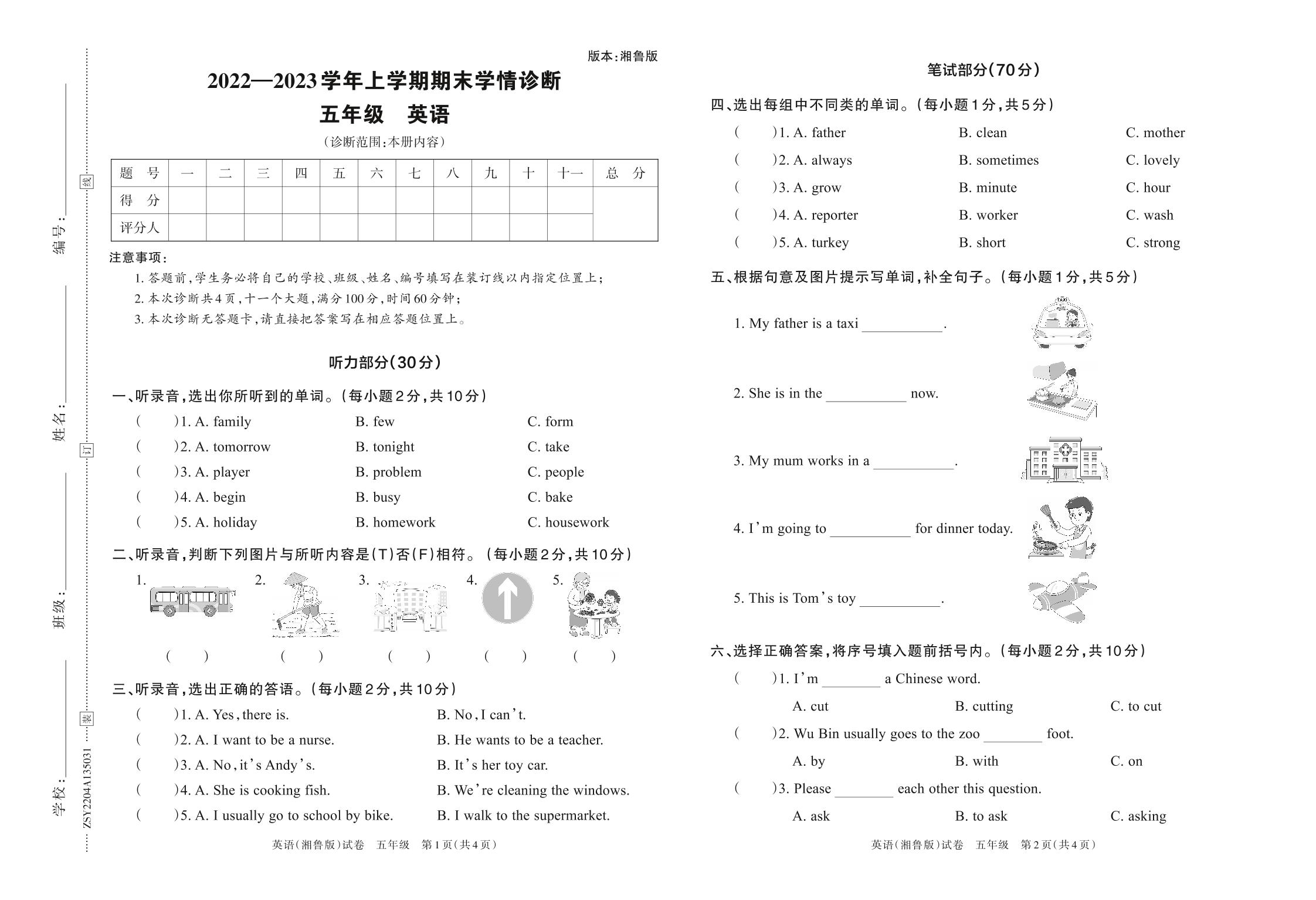 河南省濮阳市清丰县2022—2023学年上学期期末学情诊断试卷五年级英语(湘鲁版)