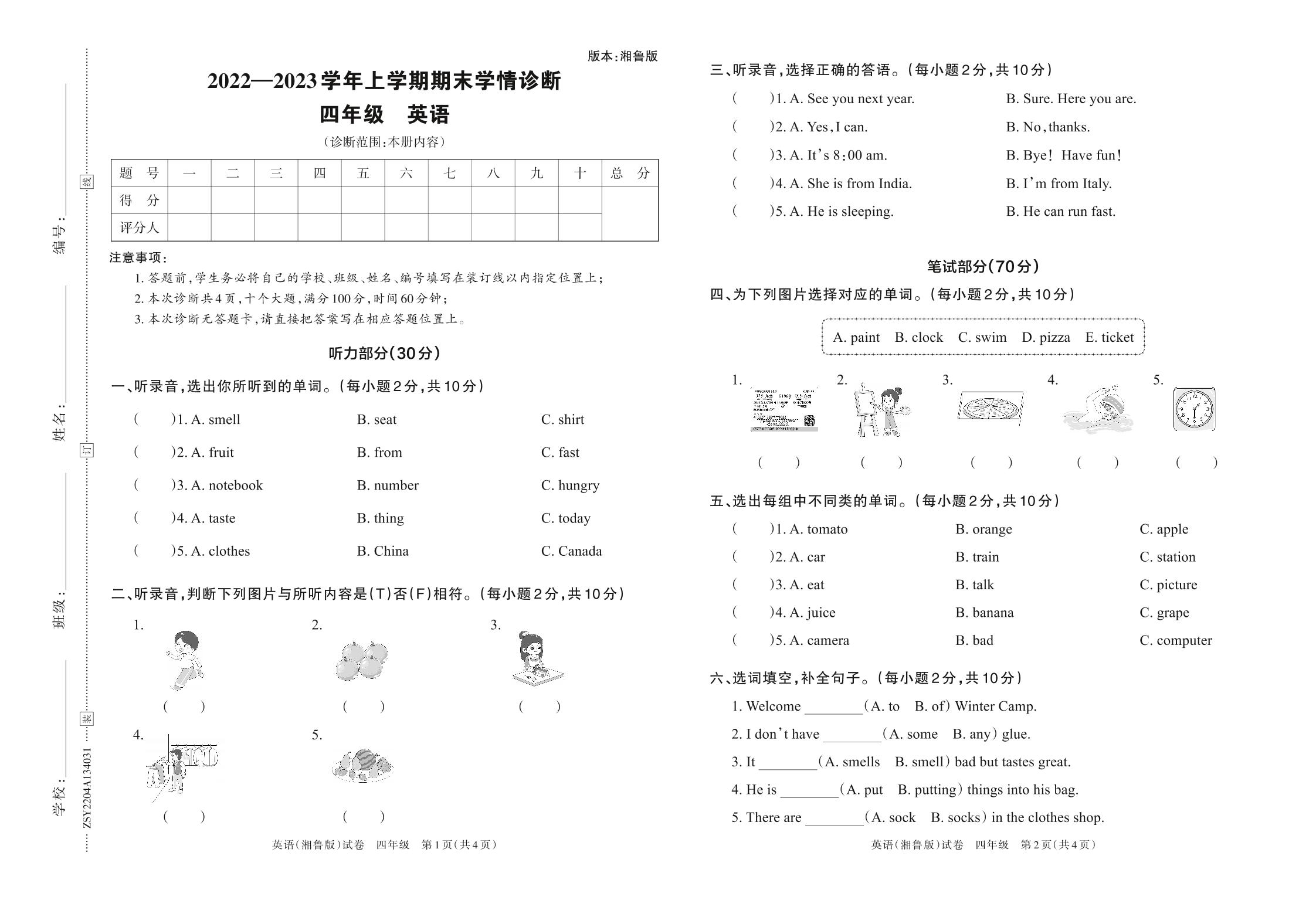 河南省濮阳市清丰县2022—2023学年上学期期末学情诊断试卷四年级英语(湘鲁版)