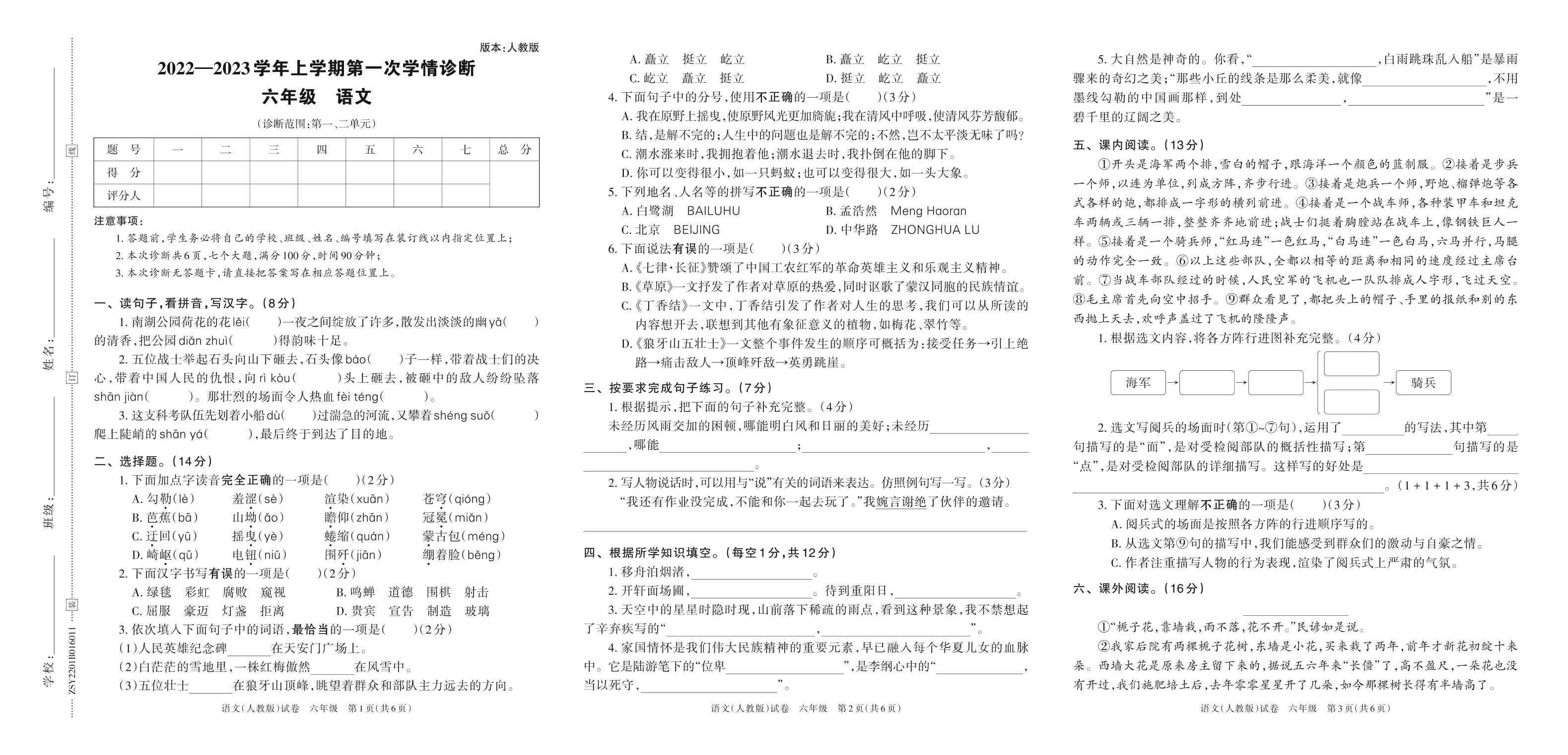 河南省周口市西华县第二实验小学2022—2023学年上学期第一次学情诊断试卷六年级语文(人教版)